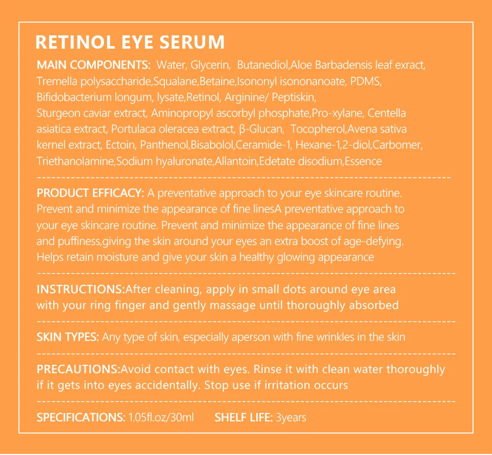 Окисление кожи после долгого пребывания на мобильный телефон, большое воздействие Солнца, повреждение макияжа, чрезмерное использование глаз ускоряет появление проблем с кожей глазХрупкая кожа для глазУсталость глаз темные кругиТонкие линии морщинМешки для глаз отекРетинол может значительно уменьшить внешний вид тонких линийРетинол и ретинол ацетат питают и сохраняют кожу и # x27;s Молодежная текстура, уменьшает выработку меланина, стимулирует метаболизм и ускоряет Срок годности меланина[Ретинол]После впитывания кожи ретинол может действовать на кожу,Ускорение производства коллагеновой гиалуроновой кислоты, замедлениеВызревание кожи, и делает ваши глаза заметно обновленными.