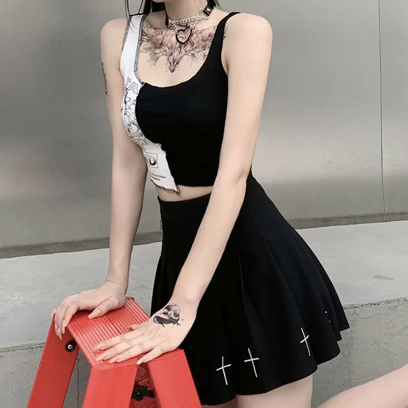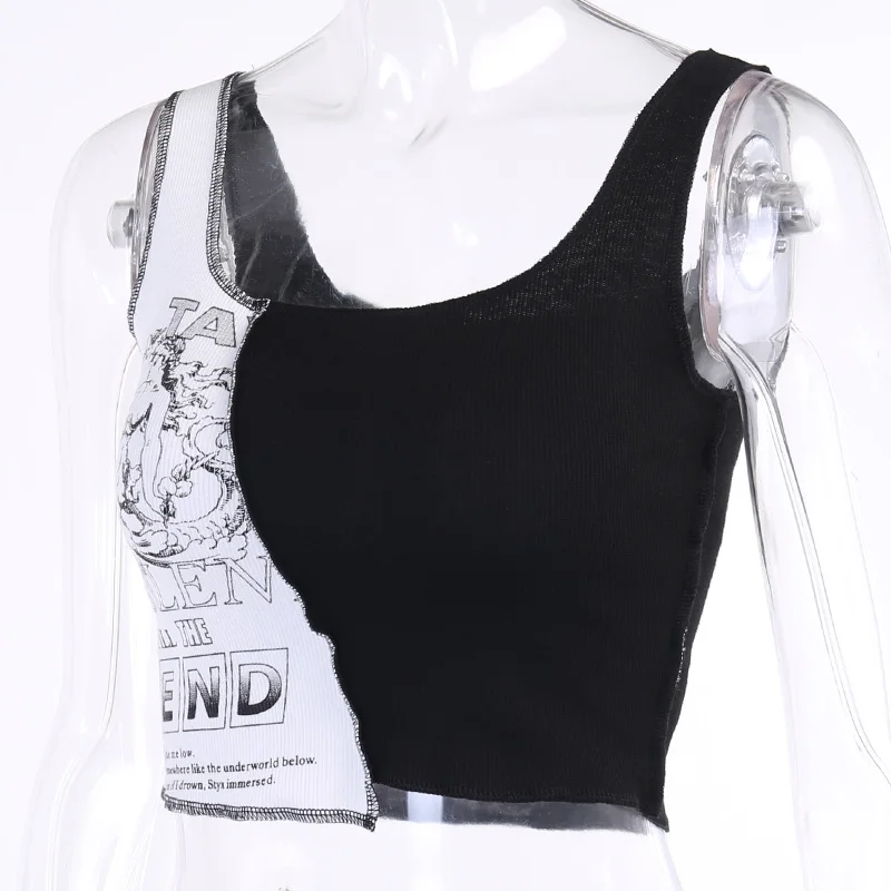 Черно-белая Лоскутная майка, уличная одежда, облегающие майки в стиле панк с забавным принтом, женские пикантные укороченные топы в стиле Харадзюку без рукавов