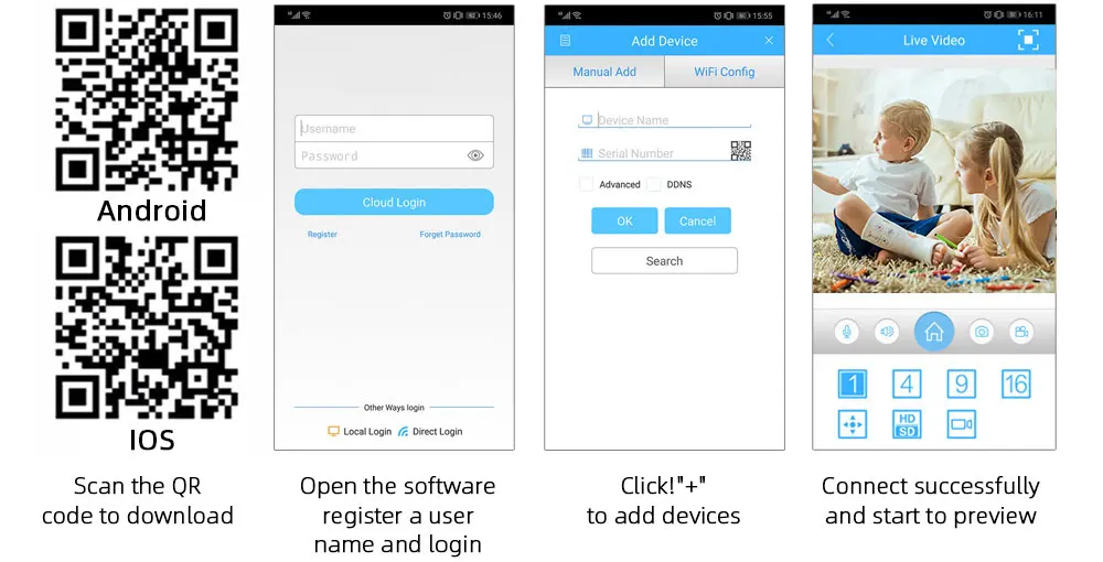 Простая настройка, всего 4 шага для просмотра мобильный телефон, просмотра видео в режиме реального времени из любого места и в любое время с помощью смартфона, стола или ПК с передовой технологией P2P, вы можете получить удаленный доступ к вашей системе за считанные минуты или меньше, нет необходимости в переадресации, удаленный доступ никогда не был таким простым!