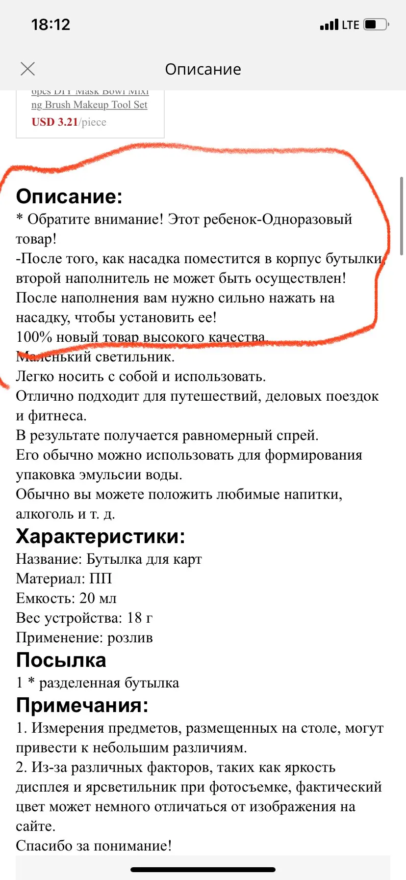 Обратите внимание, что это одноразовый флакон! А не перезаполняемый как написано в характеристиках товара. Когда он пришёл а разобранном состоянии, первое что я сделала, это попробовала его собрать, пустым естессно. И больше не смогла его открыть. Зашла сюда, в поисках отзывов или описания как его открыть. А там уже обнаружила (не в описании под товаром и даже не в характеристиках, а в другом разделе подпись, что это одноразовая вещь) вопрос, если я заказываю refillable, то мне не нужна одноразовая бутылка. Такие в магазине продаются уже наполненные. Фото прилагаю, 1 как описан товар, 2 его характеристики и 3 закрома описания, где написано, что он одноразовый. Продавец, может стоит это указывать большими буквами под товаром?? Деньги небольшие. Но смысл я это покупала ждала и ходила забирать?
