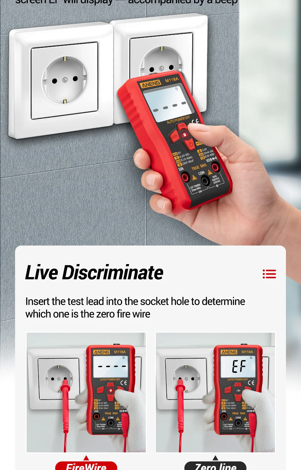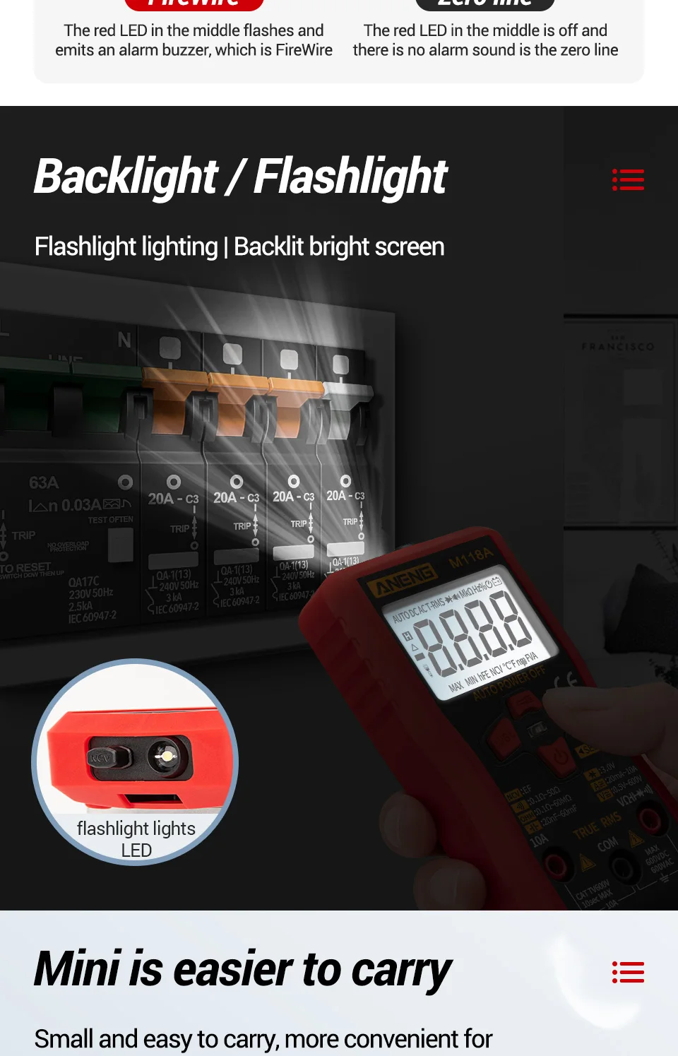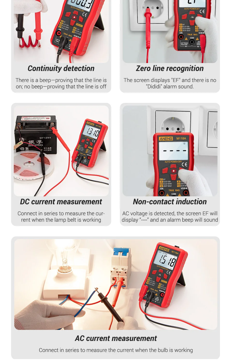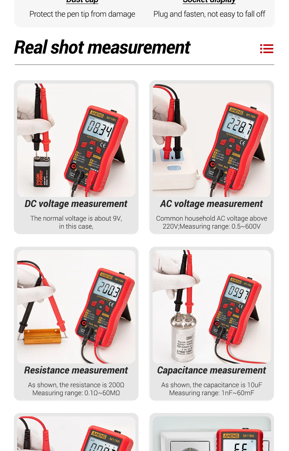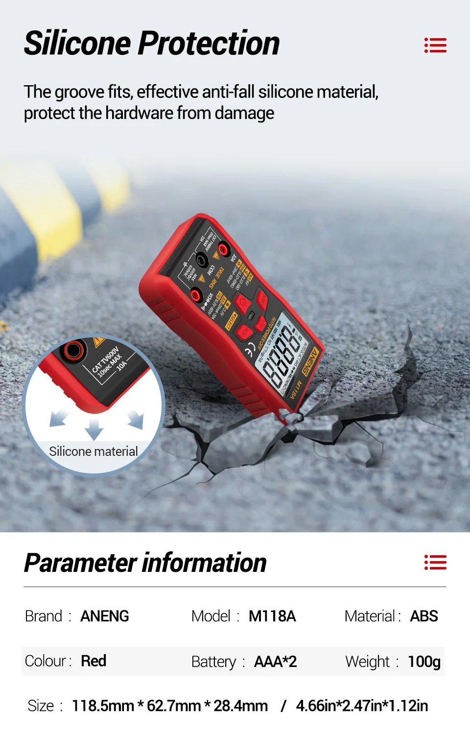 Specifications:Brand: ANENGMaterial: ABSColor: Black/Red(optional)Display: LCDMax. Display Value: 6000 countsAutomatic Shutdown Time: 15 minutesMaximum Operating Height: 2000 metersBattery Type: AAA alkaline battery(2pcs)(NOT INCLUDED)Item Size: 14.27*7.74*2.38cm / 5.61*3.04*0.93inItem Weight: 183.5g / 6.47ozPackage Size: 17*12.7*4.5cm / 6.69*5*1.77inPackage Weight: 335g / 11.81oz