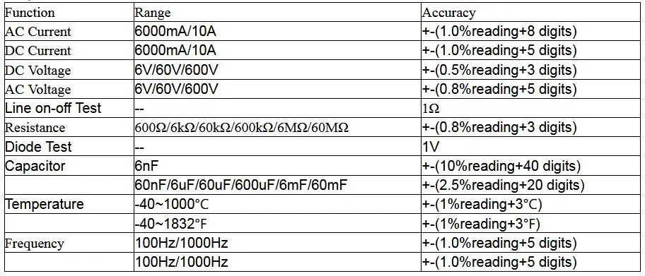 Диапазон измерения ёмкости6nF/60nF/6uF/60uF/600uF/6mF