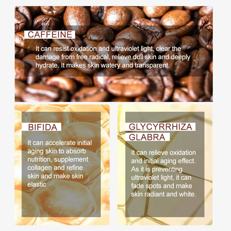 ★1. КофеинОн может противостоять окислению и ультрафиолетовому светильник, очистить от повреждений от свободных радикалов, снять тусклую кожу и глубоко увлажнить. Делает кожу водонепроницаемой и прозрачной.★2. БифидаОн может ускорить первоначальное старение кожи, впитывать питание, дополнять коллаген и улучшать кожу и сделать кожу упругой★3.Glycyrrhiza GlabraЭто может облегчить окисление и начальный эффект старения. Поскольку он предотвращает ультрафиолетовый светильник, он может выцветать пятна и сделать кожу сияющей и белой.