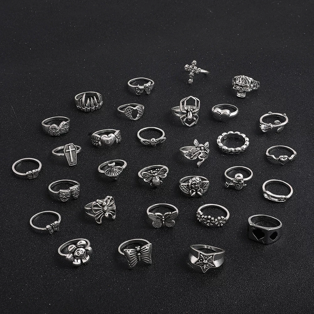 Массивные готические панковские кольца в виде паука, черепа, ангела для женщин, винтажные посеребренные кольца с подвесками в виде цветов, сердца, бабочки, ювелирные изделия