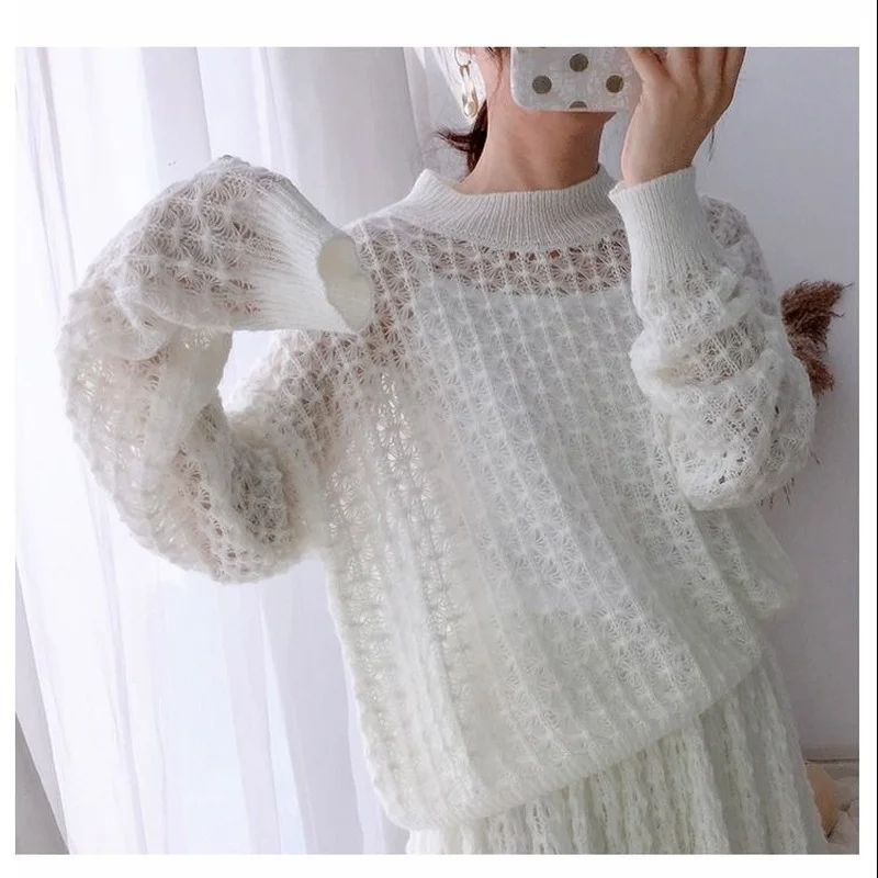 Новинка, костюм-свитер, платье, белый кавайный свободный ажурный вя...