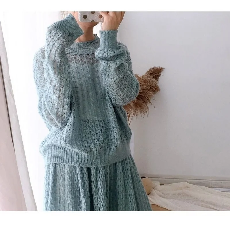 Женский трикотажный Костюм-двойка, Белый свободный ажурный пуловер, юбка-свитер, 2021