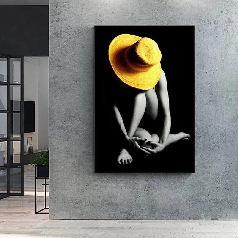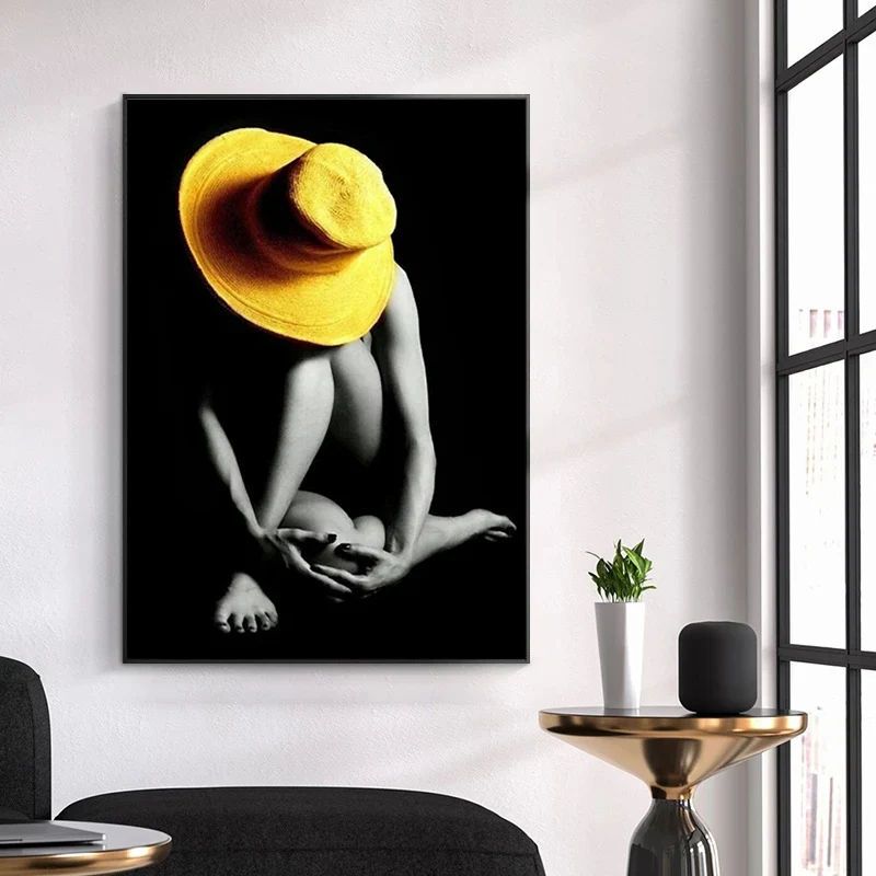 Сексуальная обнаженная женская фотография, современные плакаты и принты, женская одежда, желтая шляпа, Настенная картина для гостиной, домашний декор