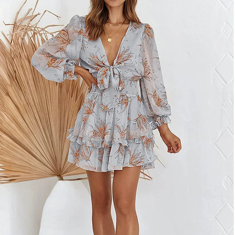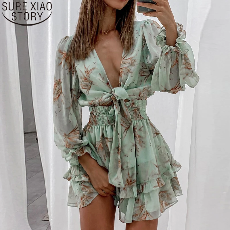Осеннее шифоновое платье с V-образным вырезом и длинным рукавом, милые платья с цветочным принтом и оборками, женское сексуальное короткое Мини-Платье трапециевидного силуэта, платья 17301