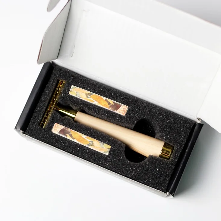 Т-образная классическая бритва. ✅ Доставка в глубь России составила две недели. Бритва была упакована в конверт со стенками из пузырчатой упаковки. ✅ В комплекте идут 10 лезвий. ✅ Ручка сделана из дерева, в руке бритва лежит надёжно и удобно. Внешне бритва очень красива. ✅ Основание у ручки широкое, поэтому бритву можно ставить вертикально на ровную поверхность. ✅ Лезвие устанавливается очень легко. Просто откручивается головка от ручки и затем в неё устанавливается лезвие. ✅ Бреет бритва отлично, порезов на коже не оставляет.
