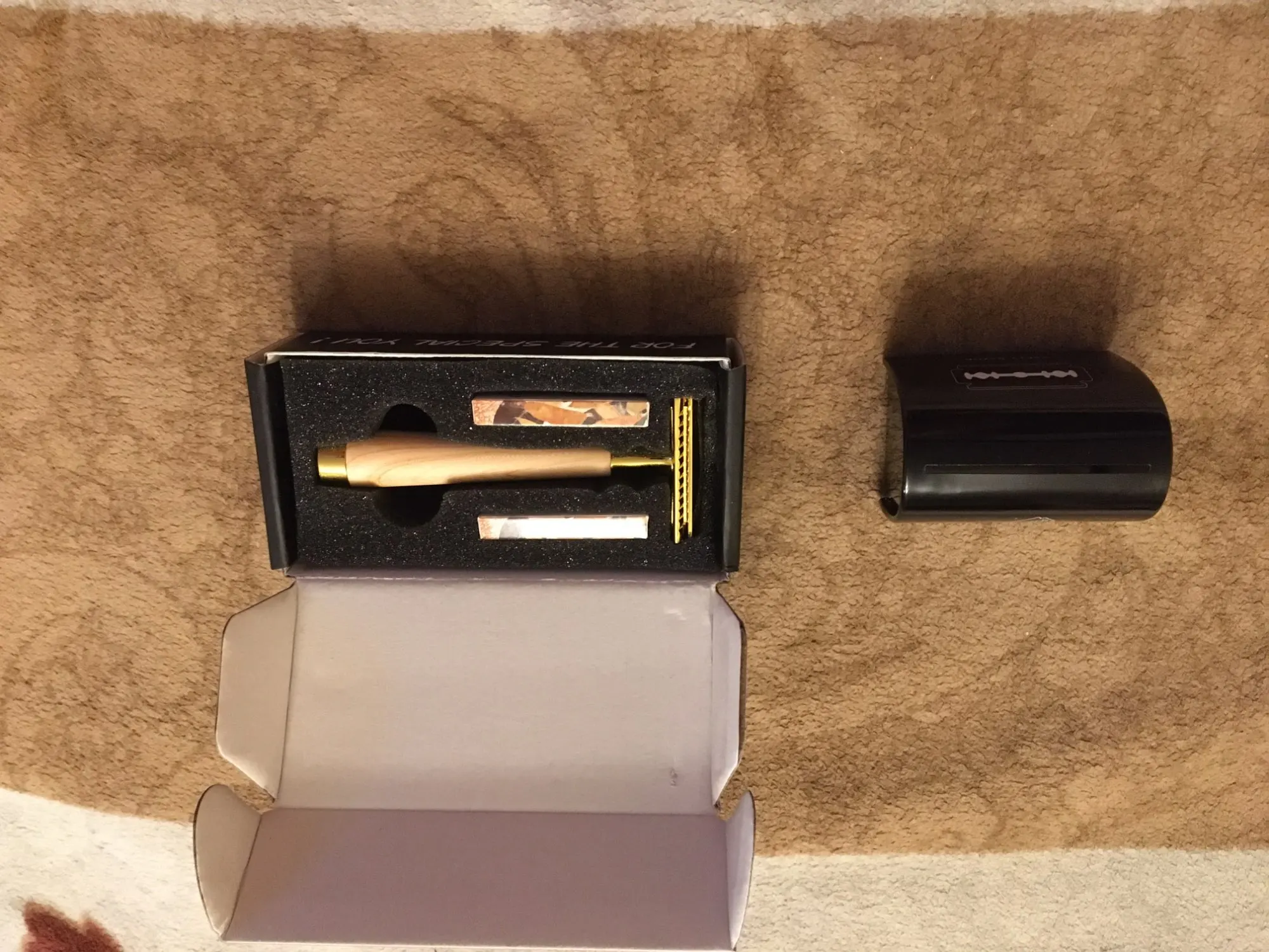 Классическая безопасная Т-образная бритва, которая обеспечивает высокое качество бриться. Посылка приехала очень быстро. В жёлтом пакете с пупыркой лежала коробка, в которой была бритва и два набора лезвий по 5шт. Отдельно была обернута в бумагу коробка для хранения лезвий. Лезвие устанавливается очень легко - для этого достаточно открутить головку. Выглядит бритвенный станок красиво и качественно, очень рада такому приобретению.