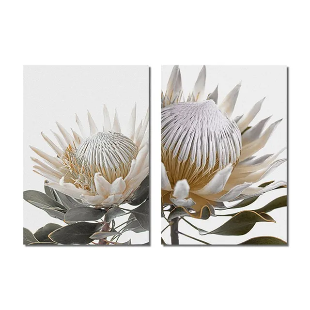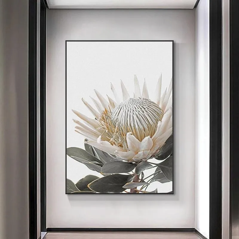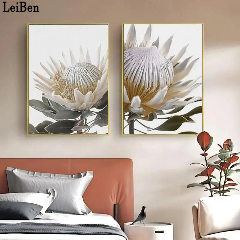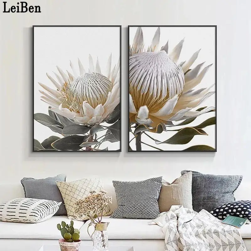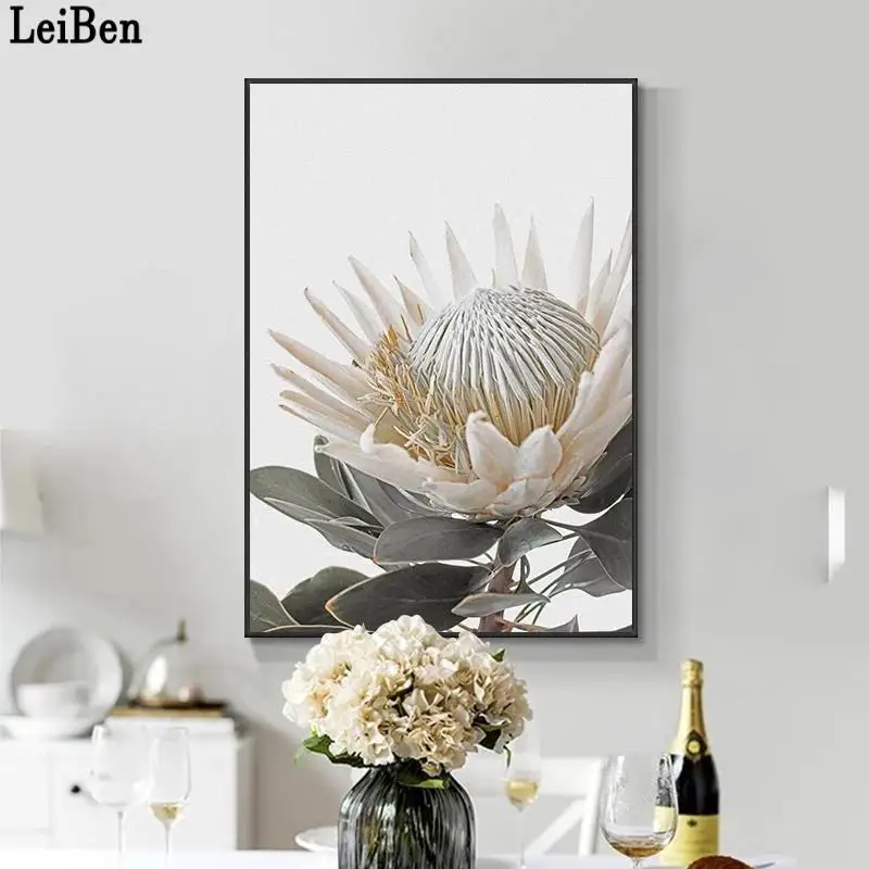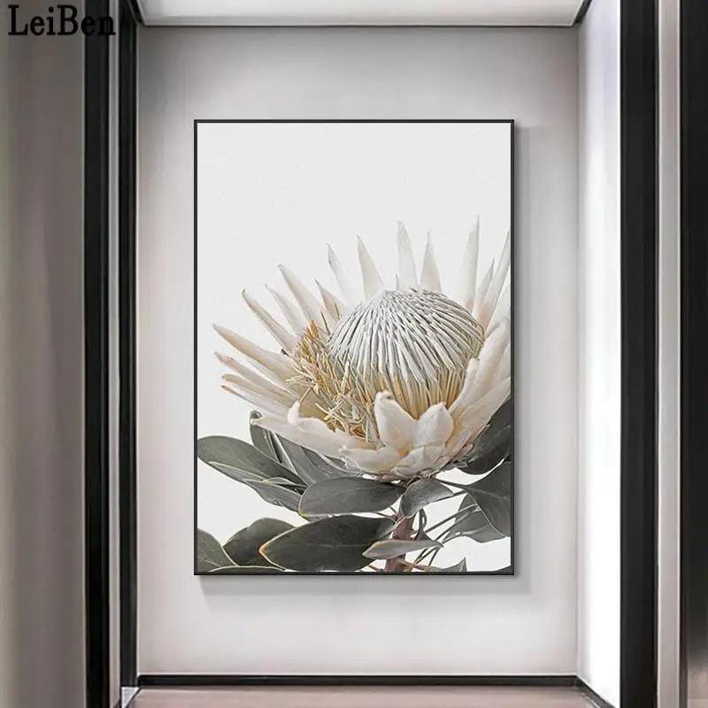 Плакат Protea белый в стиле ретро, цветок с зелеными листьями, скандинавский холст, настенные картины для гостиной, Декор, живопись интерьера