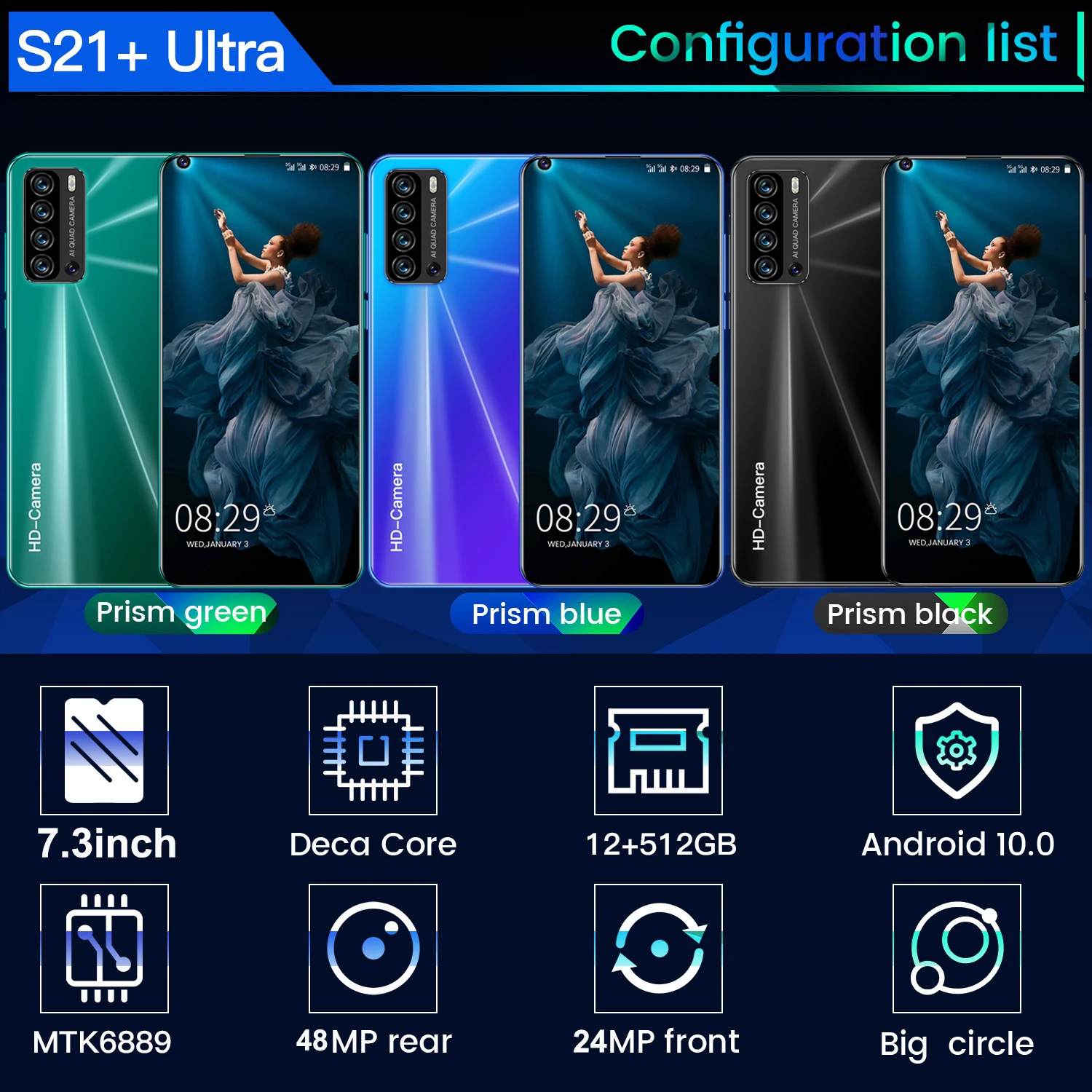 Уникальный смартфон S21 + Ultra, 7,3 дюйма, 4Gтелефон, разблокировка 24 Мп + 48 МП, 12 Гб + 512 ГБ, 5600 мАч, мобильные телефоны Android, смартфон