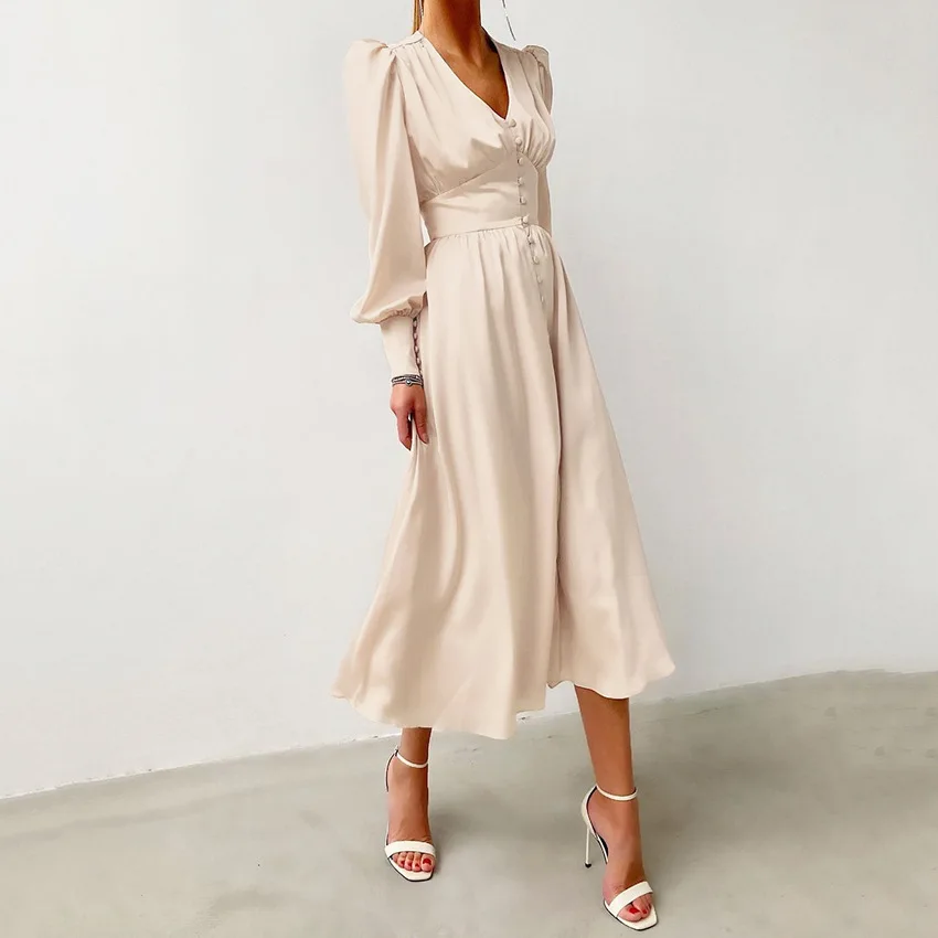 Женское однобортное атласное платье миди VestidosMujer, бежевое эле...