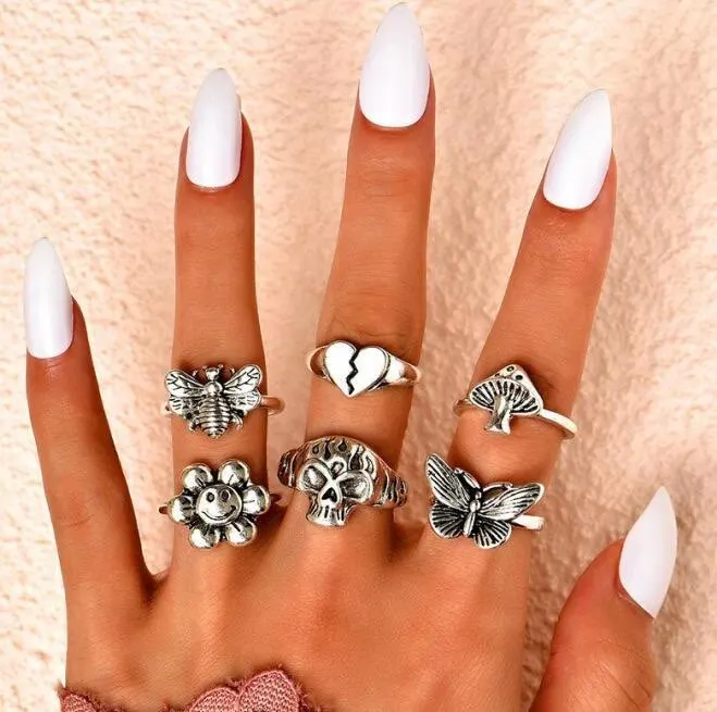 Кольцо в стиле панк, готика набор пчела цветок гриб бабочка любовь череп для женщин винтажные серебряные Ретро очаровательные украшения на палец