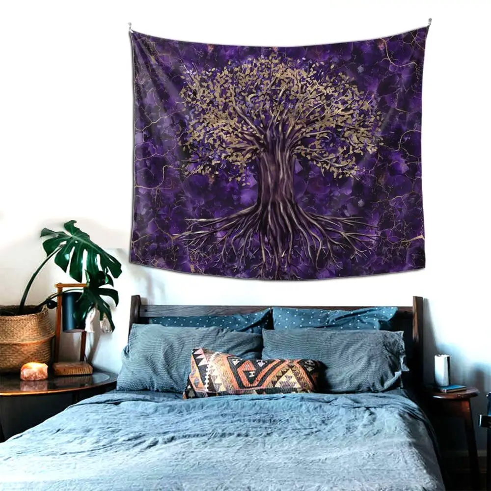 Настенный гобелен с изображением дерева жизни, аметиста, золота, викингов, большой настенный гобелен, викинги, загадочная стена