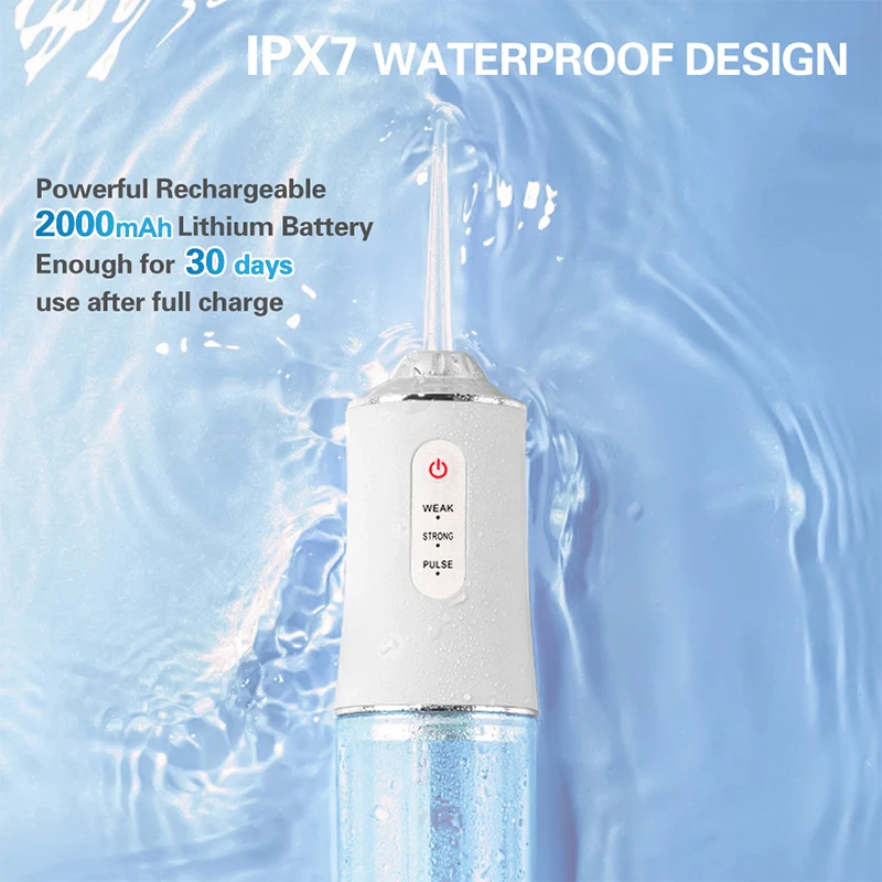 Зубочистка для струи воды является водонепроницаемым IPX7 и имеет емкость для воды объемом 220 мл, которая имеет хороший срок службы и удобна для ежедневного использования без повторного заполнения