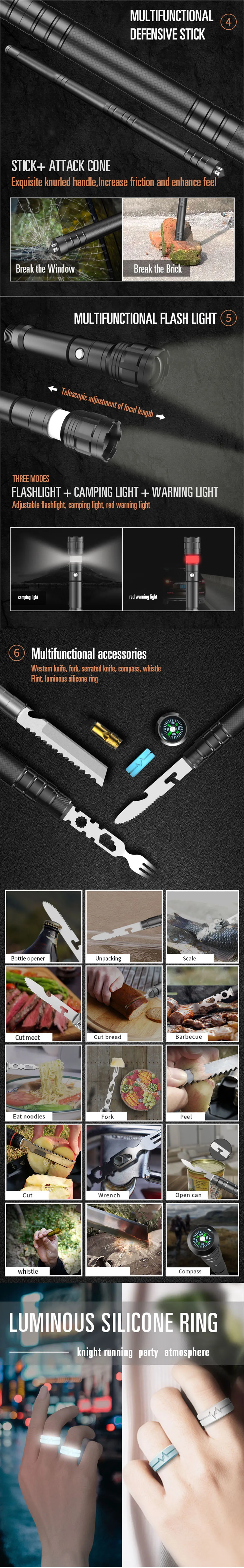 Особенности1. Многофункциональная Вспышка: выдвижная конструкция, есть три способа освещения (вспысветильник используется для ночных прогулок, освещения дороги, масштабирования; Походный свет, ночной Кемпинг можно использовать для освещения, предотвращает безопасность; Сигнальная лампа, красный светильник может излучаться сигналом опасности, используется для предотвращения опасности и используется для спасения. )2. Головка лопаты, метод складного преобразования имеет разные цели; Например: раскопки, Пиление, резка, защита на поле. Головка лопаты съемная и может быть превращена в топор или кирку, из которой используется для рубки, долота, фиксации, резки растительности или веревки и т. д. он разработан и произведен для любителей кемпинга на открытом воздухе.3. Рукоятка лопаты, инновационный и компактный процесс накатки, более удобна в удержании и усиливает ощущение руки.Уникальное сочетание разборки и сборки может быть безопасно преобразовано и использовано в различных формах для защиты безопасности.4. Многофункциональный тактический топор (топор + хвостовой серп)Многофункциональная тактическая Кирка (Пилообразная Кирка + хвостовой серп)5. Первый встроенный ударный конус ручки может легко разбить окно, а также может использоваться для самообороны.