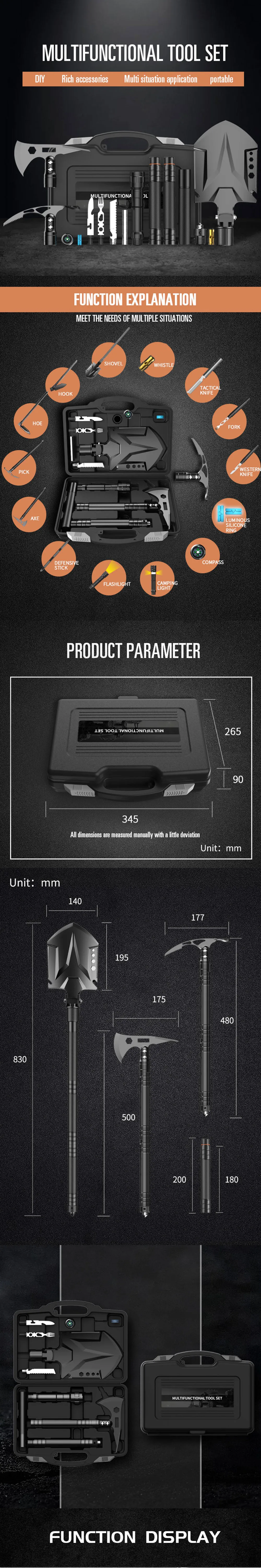 Посылка:1 * фонарик (батарея в комплект не входит)1 головка лопаты1 * соединительный стержень2 * удлинитель1 * Компас1 * Многофункциональный нож1 * Многофункциональная вилка1 * пищевой нож1 * головка аварийного молотка1 * свисток1 * светящееся Силиконовое кольцо1 * чехол1 * Многофункциональный топор (вариант топора)1 * Многофункциональная мотыга (опция 15 шт.)