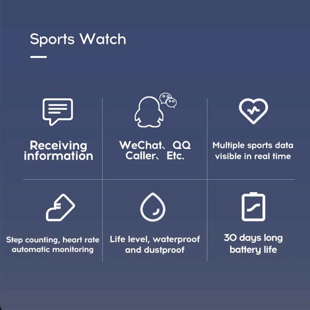 Подсчет шагов, расстояние упражнений, сожженные калории, пульс, кровяное давление, мультиспортивный режим, напоминание по телефону, напоминание о будильнике, подсветка рук и экрана, социальное общение (WeChat, QQ, Facebook, twitter) и т. Д.