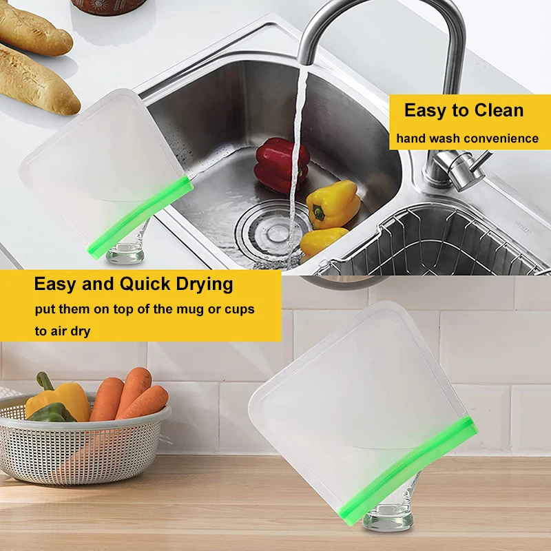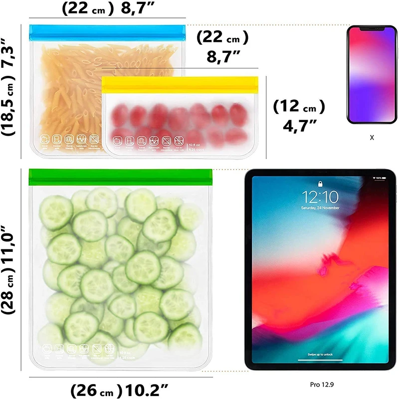 The 1 reusable gallon freezer bags (11 inches x 10 9/16 inches) are great for marinating meats, frozen foods, cereal, cookies, knitting materials, office supplies. The reusable sandwich bags is 8 5/8x 7 5/8 inch and the reusable snack bags is 8 5/8 x 5 1/4 inch, perfecting for sandwiches, snacks, lunch, vegetables, fruit, babies food, cosmetics, jewelry make-up, stationery, travel and more. Transparent design allows for a quick glance at contents inside.