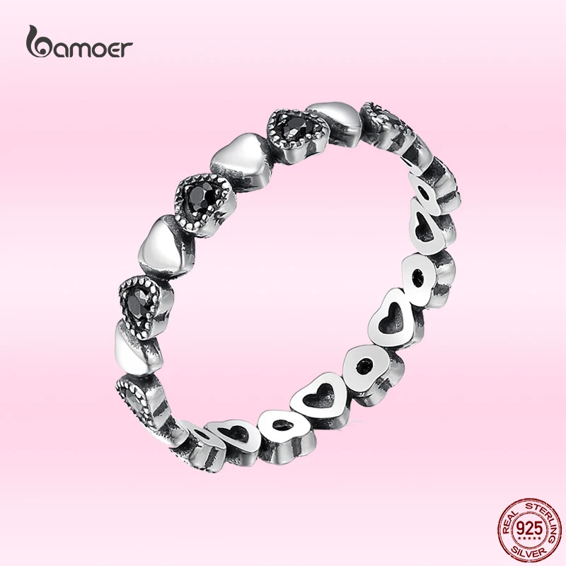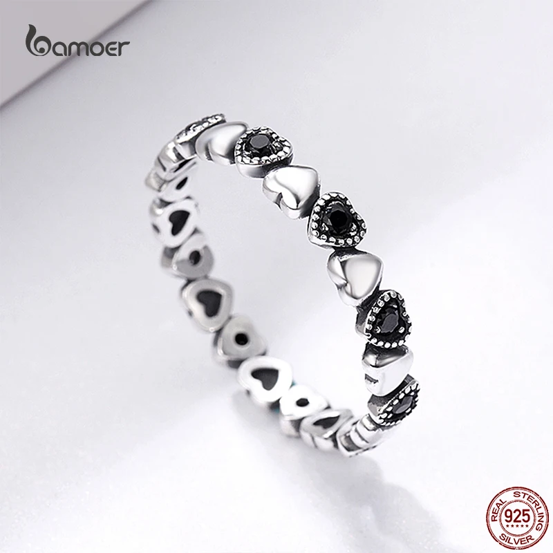 Классические кольца на палец в форме черного сердца Bamoer для женщин, прозрачные чешские кольца из настоящего серебра 925 пробы, штабелируемые кольца, оригинальные ювелирные изделия