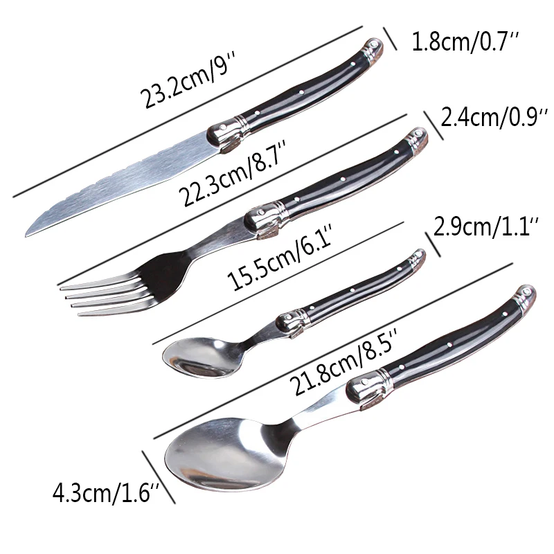 4-24 шт Стиль Laguiole набор посуды по вашему заказу1 Набор 4 шт. посылка включает в себя: 1 нож для ужина x 1 вилка для ужина x 1 ложка для ужина x 1 чайная ложка2 набора 8 шт. посылка включает в себя: 2 столовых ножа x 2 столовых вилки x 2 столовых ложек x 2 чайных ложек4 набора 16 шт. посылка включает в себя: 4 столовых ножа x 4 вилки для ужина x 4 ложки для ужина x 4 ложки для чая6 комплектов 24 шт. посылка включает в себя: 6 столовых ножей х 6 обеденных вилок х 6 столовых ложек х 6 чайных ложек