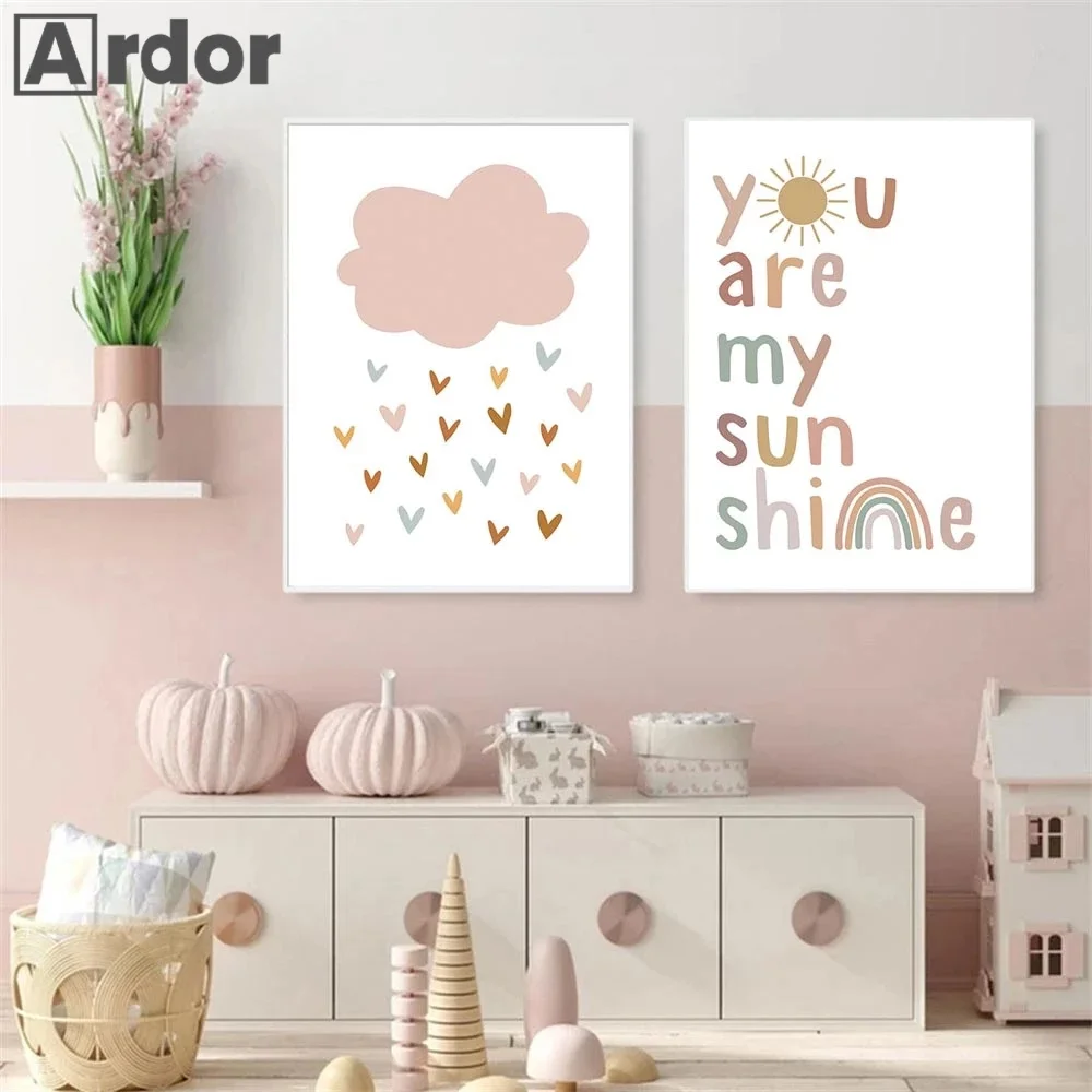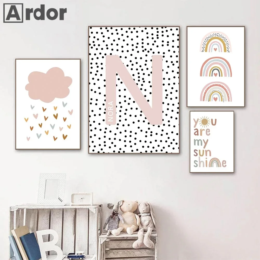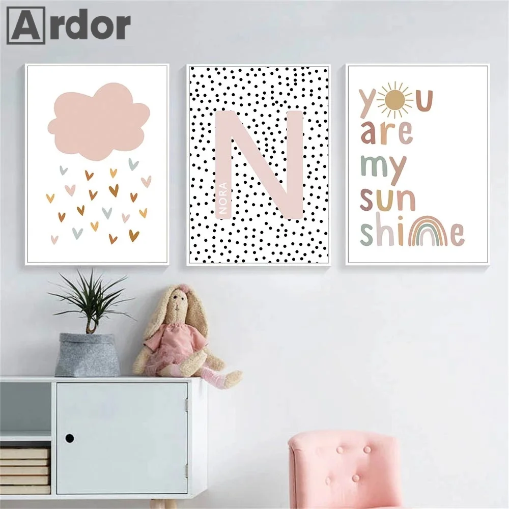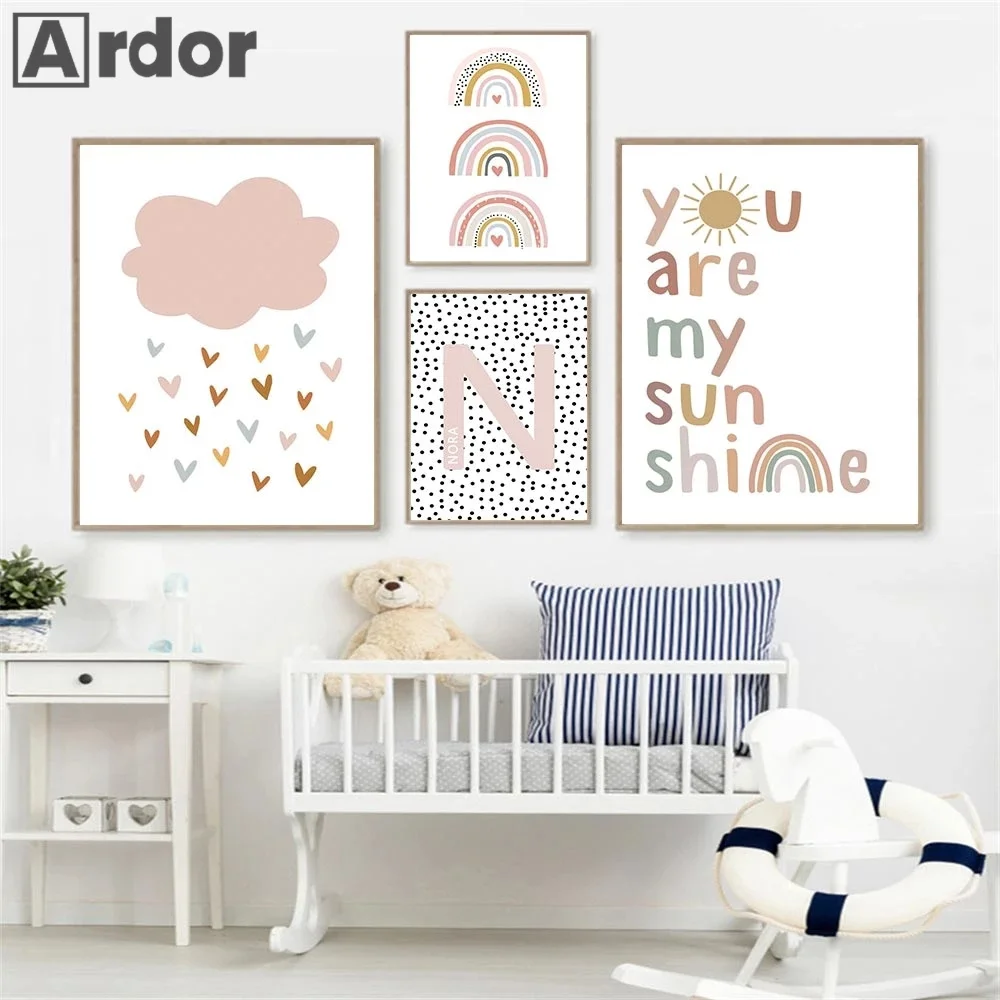 Настенный плакат с именем на заказ для девочек, радуга, солнце, облако, сердце, принты, You Are My Sunshine, цитаты, Картина на холсте, декор для детской комнаты
