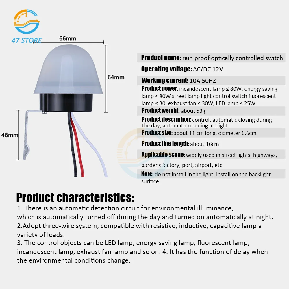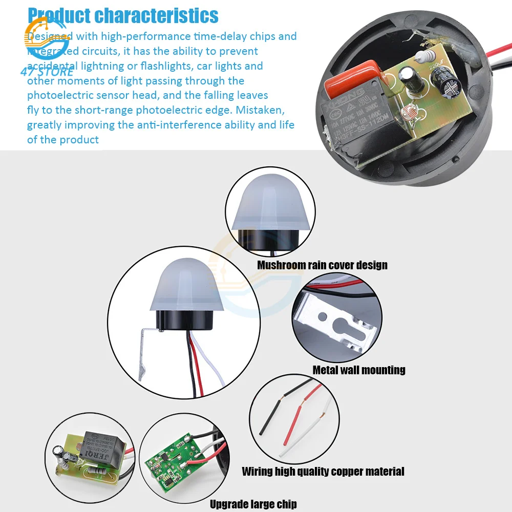1. Внутри есть автоматическая схема обнаружения окружающего освещения, которая автоматически выключается днем и автоматически включается ночью.2. Он оснащен трехпроводной системой и совместим с различными нагрузками резистивных, индуктивных и емкостных ламп.3. Объектом управления может быть светильник, энергосберегасветильник щение, флуоресцентсветильник щение, светильник ПА накаливания, вытяжной вентилятор и т. д.4. Он имеет функцию задержки при изменении условий окружающей среды и время задержки 3-5 с, что решает проблему вспышки экрана при изменении краткосрочных экологических условий.