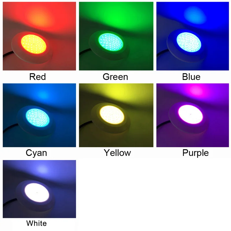 Input Voltage: DC12VLight Source: SMD 2835 LEDWatt versions:12WLumen: 855lmLamp dimension: D130xH16mmLamp Body material: PlasticLength of power cable: 1.5 meterLamp waterproof grade: IP68(can be put into water directly).Life Span: 50000 hoursLED Color version: Warm white(2700-3500K), Pure White(5500-6300K), Blue, RGB no remote