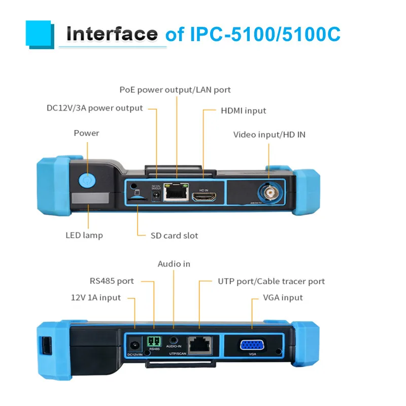 Это все-в-одном 5 дюймов маленький размер 4K камера CCTV тестер поддержка аналоговая камера высокого разрешения, TVI, CVI, CVBS IPC камеры, поддержка VGA и мультимедийный интерфейс высокой четкости. Со встроенным аккумулятором.