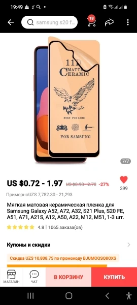 Страна: KR Color: For Samsung S21 Plus Material: 2PCS Доставка: Cainiao Super Economy Global 27.11.2021