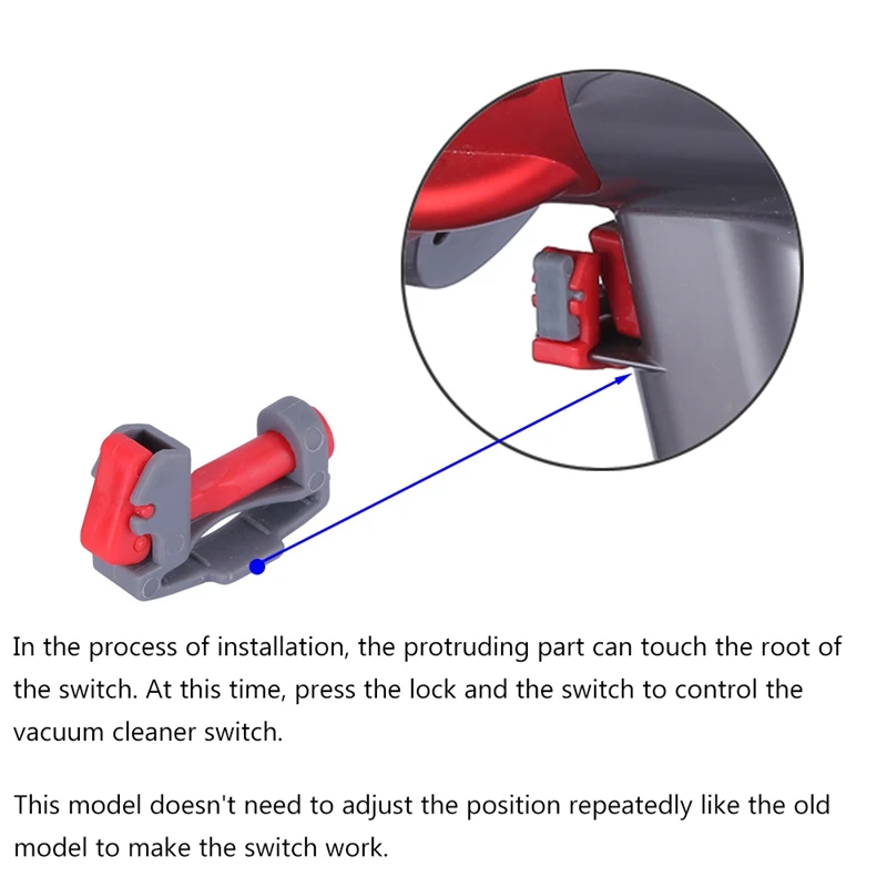 1. Кнопка блокировки устанавливается на кнопку питания пылесоса, который может легко и удобно использовать пылесос. Не нужно держать нажатие на кнопку во время пылесоса, и пальцы больше не болят.