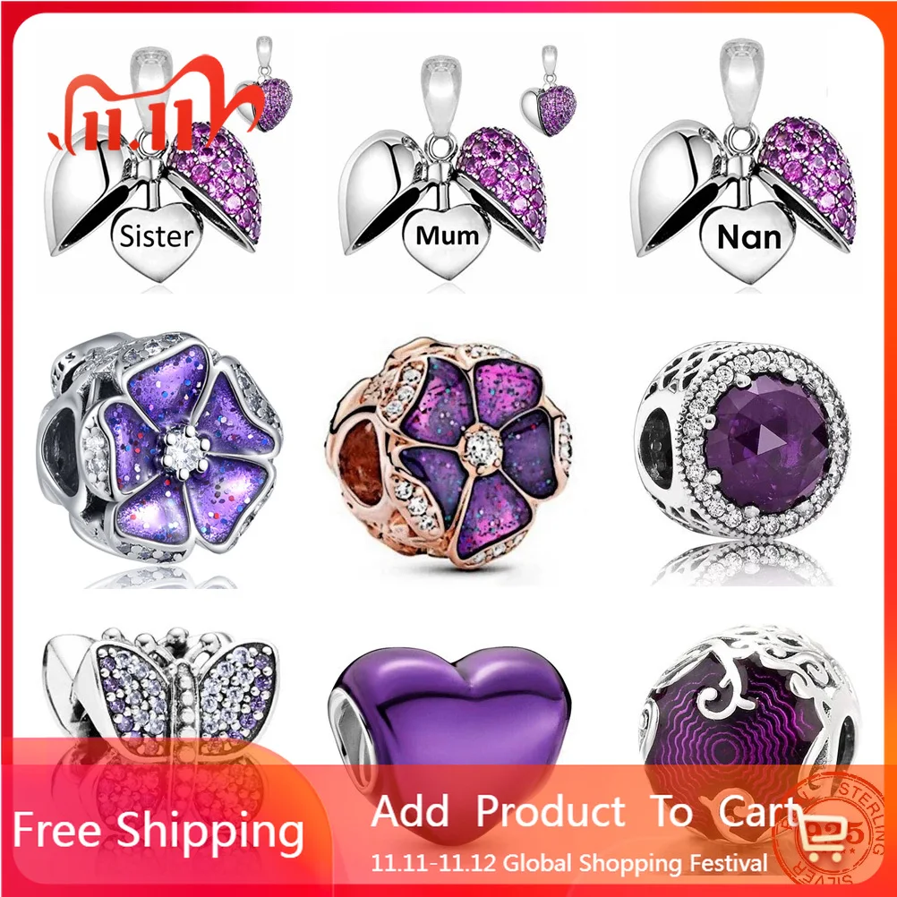 Новинка 925 Стерлинговое Серебро фиолетовая сестра мама Нан Висячие бабочки Любовь бусины подходят для оригинального Pandora браслет, ювелирные изделия с бриллиантами подлинные
