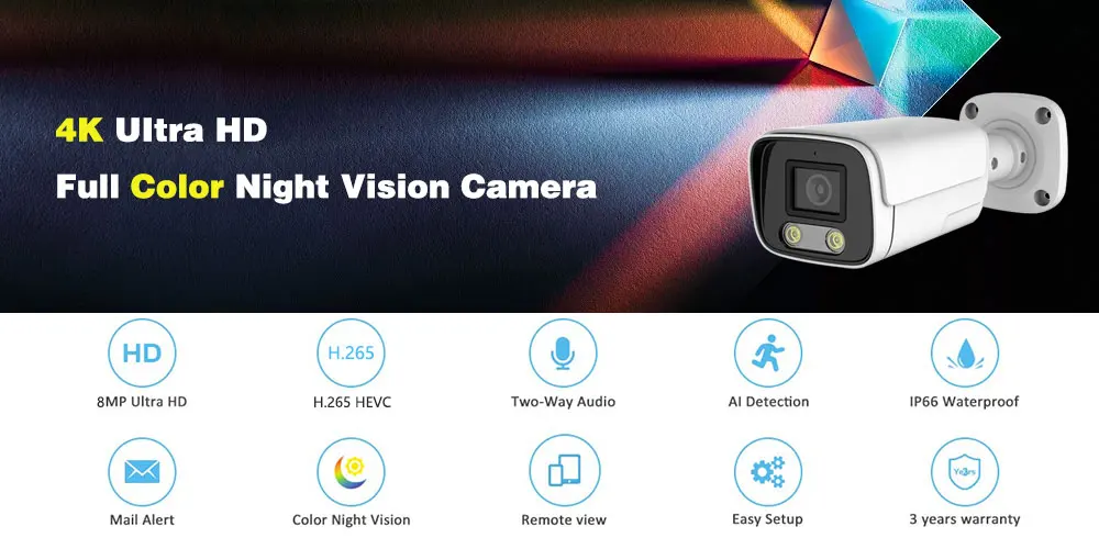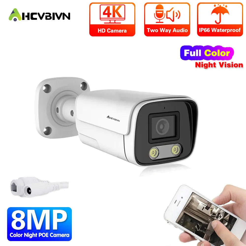 Наружная цилиндрическая IP-камера видеонаблюдения, 8 Мп, 4K POE, двухстороннее аудио, полноцветное ночное видение, 4K POE, камера видеонаблюдения