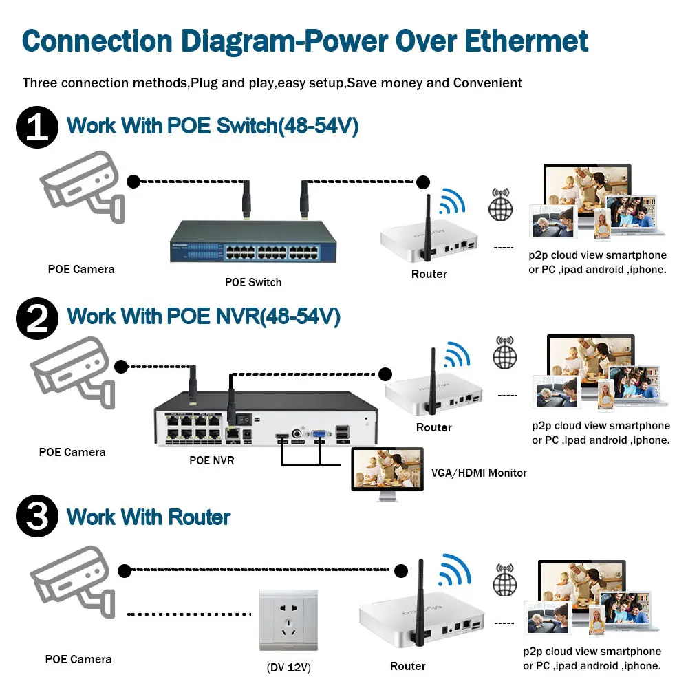 Не нужны дополнительные кабели питания или адаптеры или переключатели. Подключи и работай и простая настройка.Экономьте деньги и удобно, POE NVR = NVR + POE коммутатор.