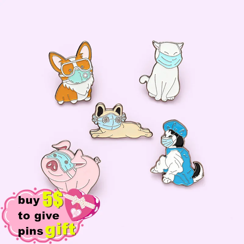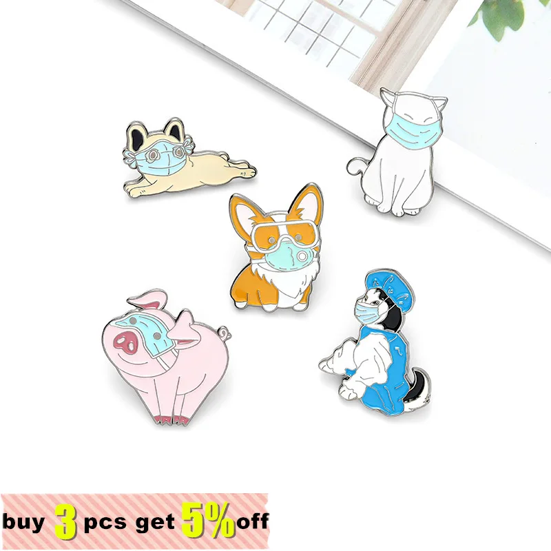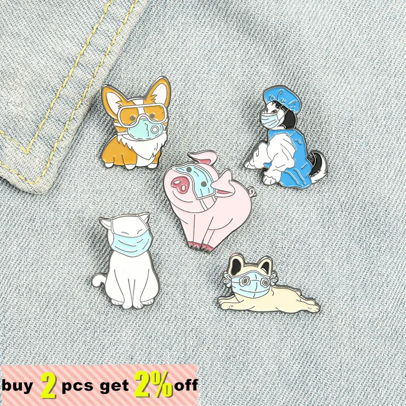 Животные в одежде противоэпидемической маски эмали штырь корги Соба...