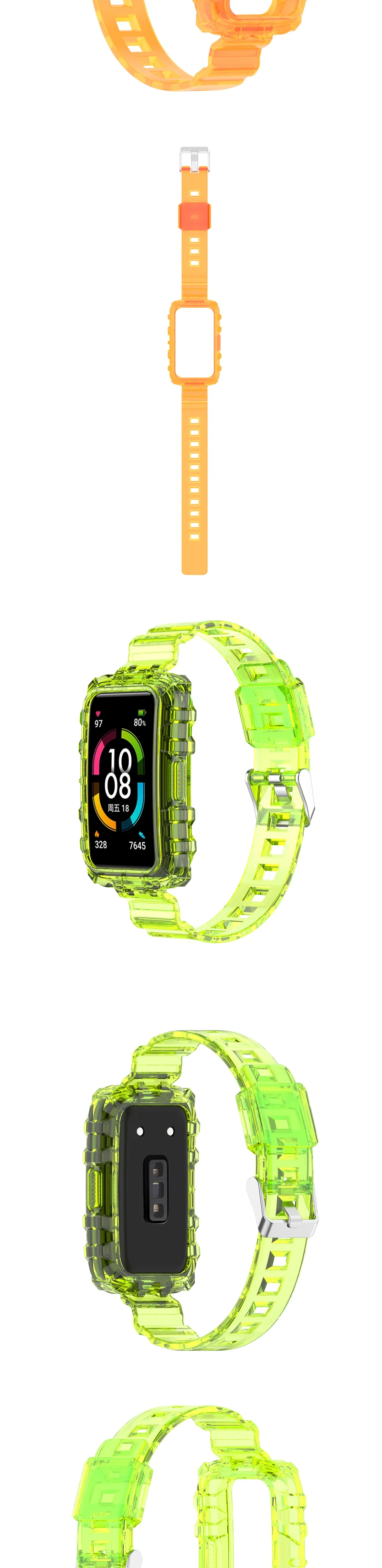 ТПУ прозрачный ремешок для наручных часов Smartband для Huawei band6 Цветной силиконовый ремешок для часов Honor Band 6 аксессуары браслетОсобенностиСовместимость с:Для Huawei Band 6Для Honor Band 6100% новый и высокое качествоЛегко снимать или сниматьСветится в темноте, очень удобно и модно.Прочный и не легко выцветаетОн приятный для кожи и обеспечивает ощущение комфорта во время снаЗащитите ваши часы Huawei от царапин, пыли или повреждений.Изготовлен из качественного кремниевого материала, экологичный и здоровый.Модный, стильный и прочный, этот браслет идеально подходитРазмер может быть скорректирован в зависимости от обстоятельств индивидуального запястья.Разнообразие цветов на выбор, красиво и модно, легко удовлетворить ваши различные потребности.Посылка включает в себя:1 x силиконовый ремешок (часы в комплект не входят)