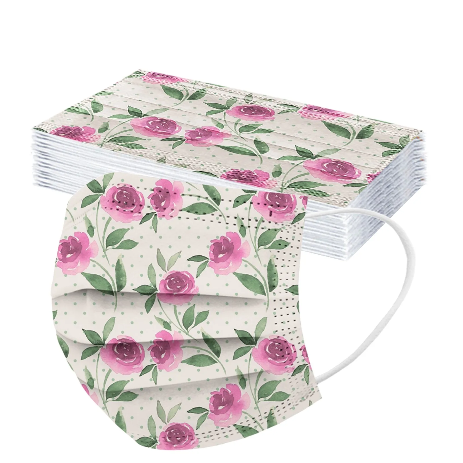 Маска одноразовая 3-слойная с цветочным узором женская, модная с фильтром, с заушными петлями, 10 шт.