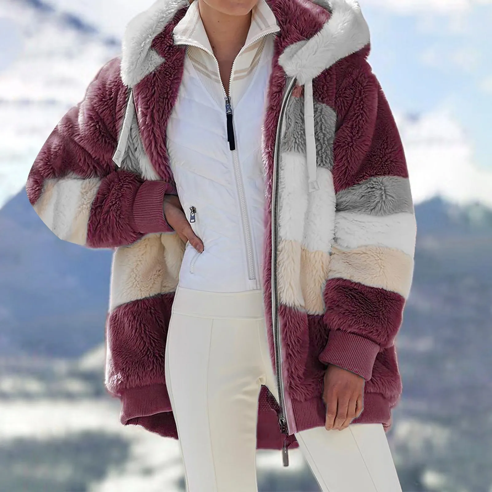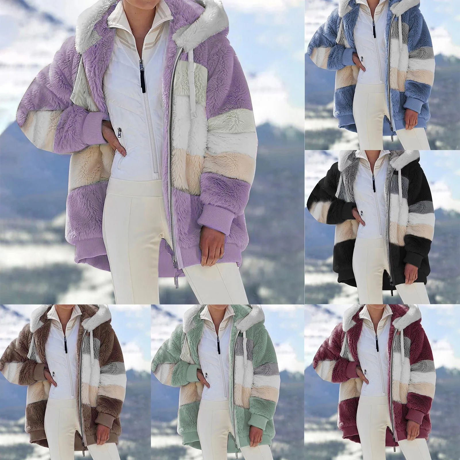 Зимнее женское пальто, модная плюшевая куртка в стиле пэчворк, зимняя куртка с капюшоном и карманами на молнии, ретро, женская одежда больших размеров с длинным рукавом