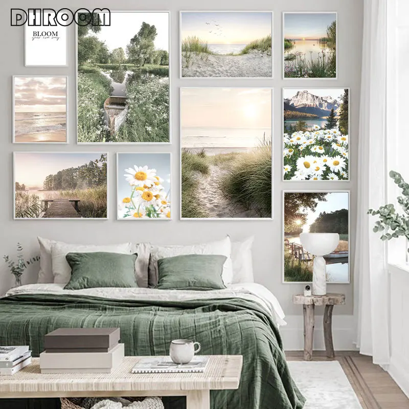 Картина с цветами, озеро, скандинавский стиль, настенные картины холст, картина стене плакат закат, природный пейзаж, настенное украшение, картина