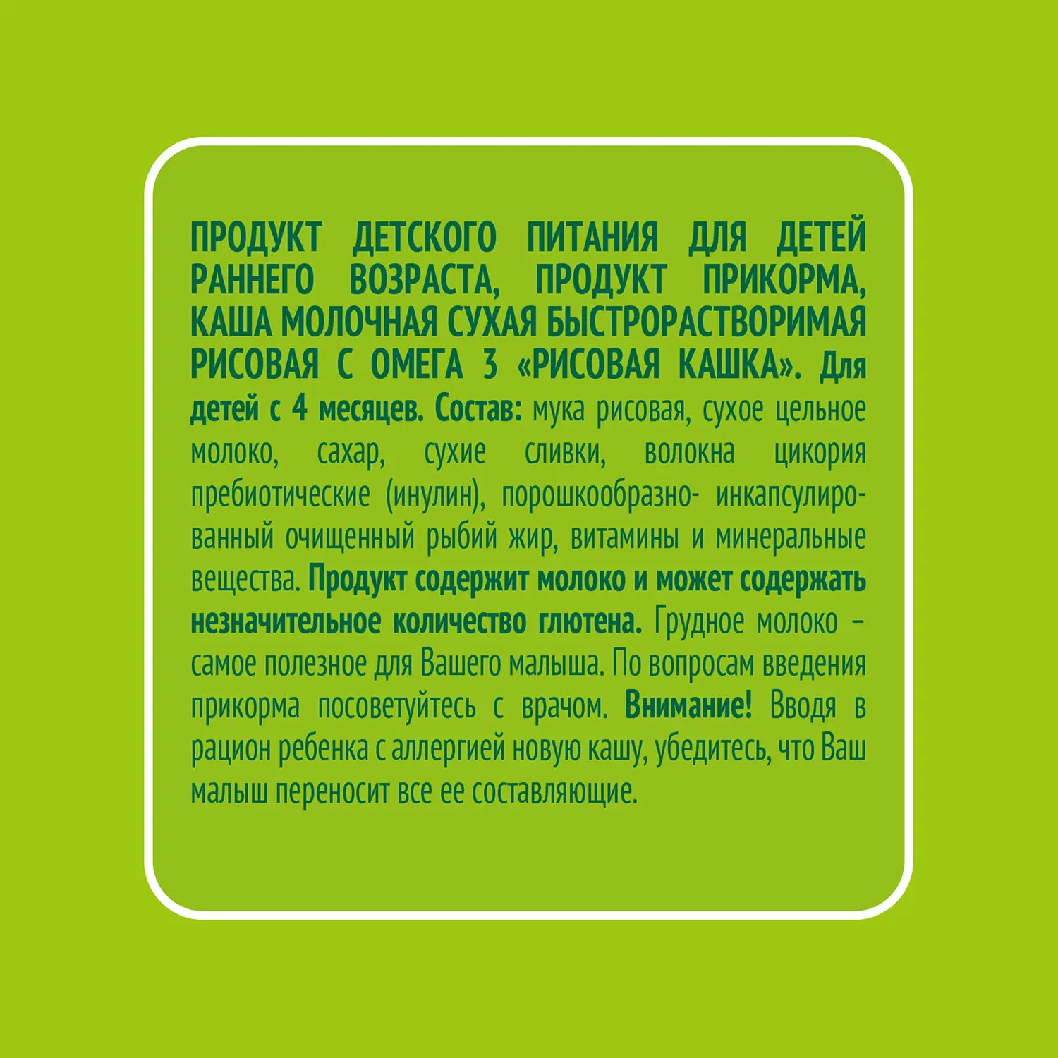Fast-soluble milk rice porridge Heinz is rich in vegetable proteins, necessary for the full development of the child's body. In the composition of porridge-vitamin E, C, B, as well as iron, zinc, calcium and other mineral compounds necessary for the active growth of the baby.Dry milk porridge "Heinz" is complemented by fatty acids omega-3, strengthening the immunity and nervous system involved in the formation and development of brain cells. The Heinz porridge is suitable for the first complementary feed: the recipe is made up taking into account the food needs of babies from 4 months.• Omega-3 for brain development *.• 100% natural cereals. Sources of protein and energy.• Prebiotic for healthy digestion.• Vitamins and minerals for active growth.• Without palm oil.Due to the high nutritional value, the milk rice porridge Heinz provides full saturation. Careful handling of ingredients by steam keeps the natural benefit of cereals.The products are created with the care of the smallest, so there are no artificial additives in it: preservatives, dyes, flavors.* Heinz porridge contains docosahexaenic acid (DHA), which is one of the necessary components for brain development.