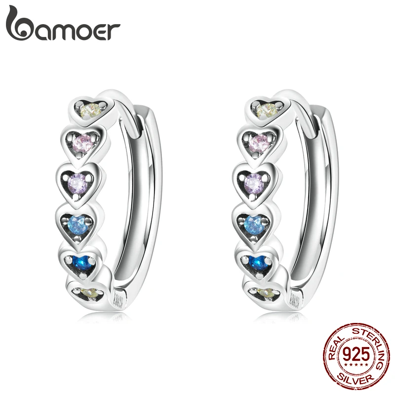 Bamoer, серьги в форме сердца, Стерлинговое Серебро 925 пробы, штабелируемые радужные циркониевые пряжки для ушей, для женщин и девочек, изысканные ювелирные изделия, DIY подарки