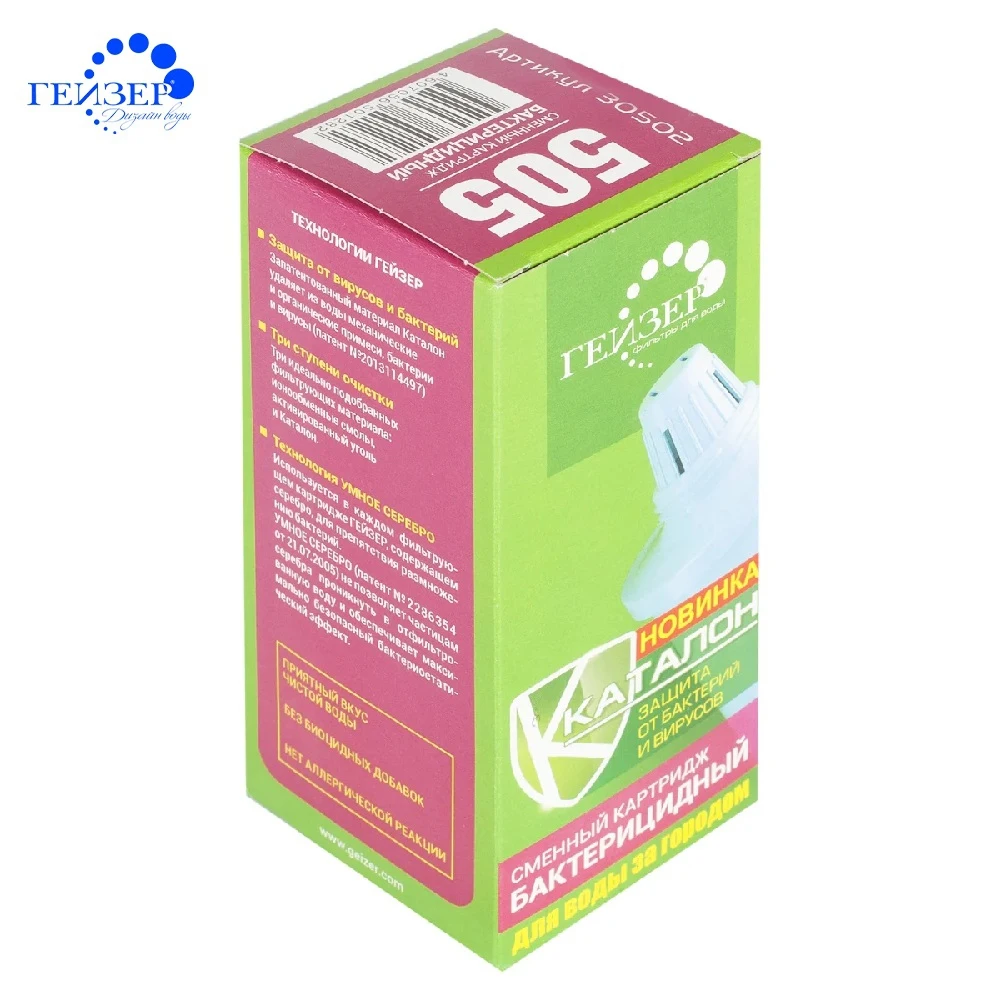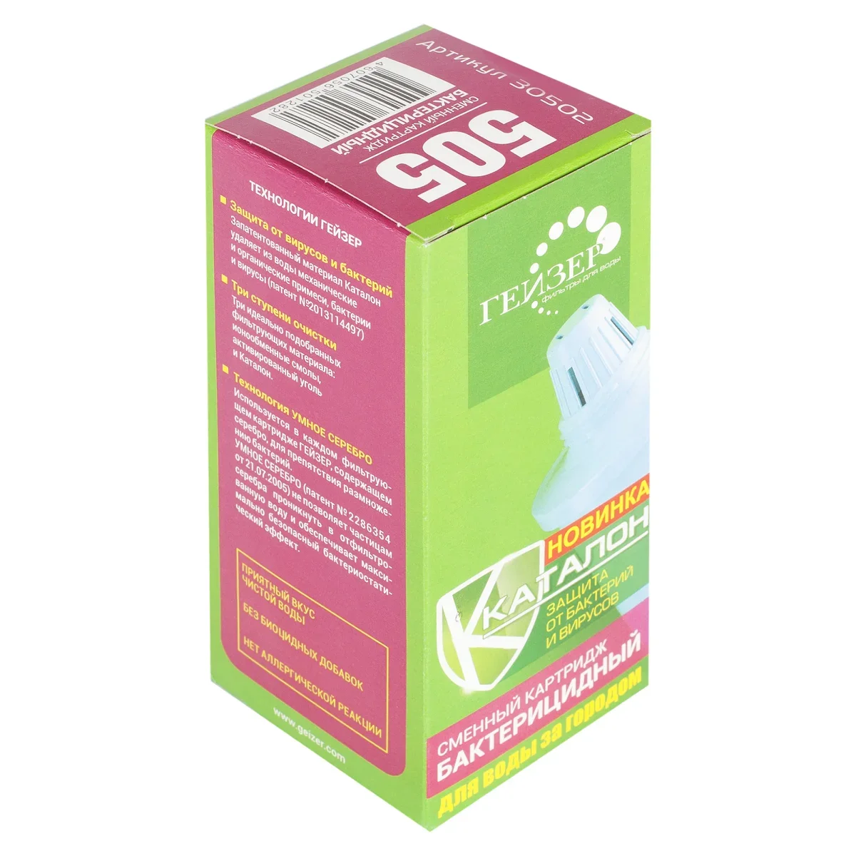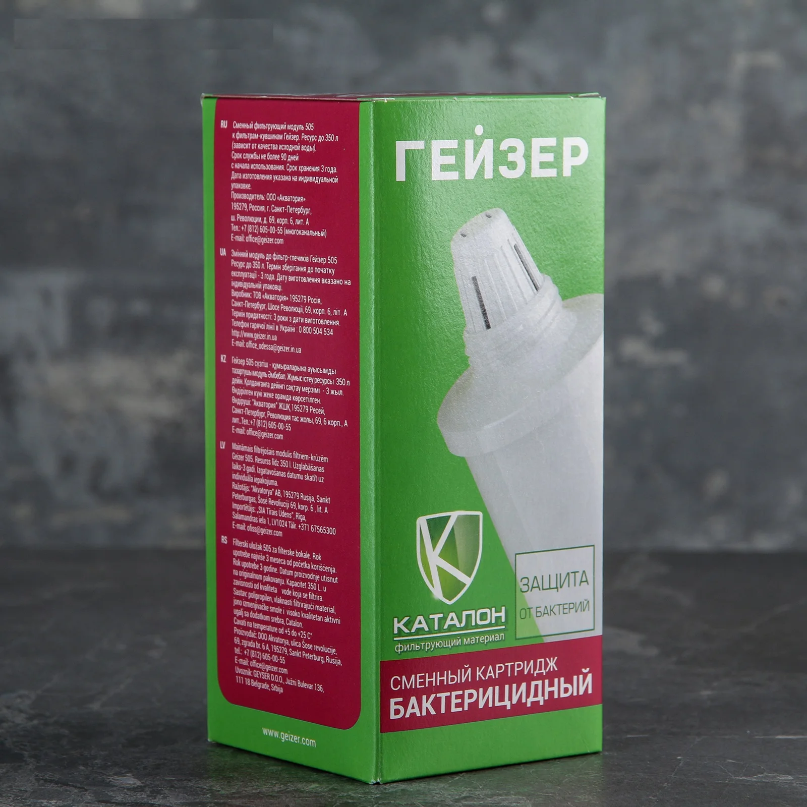 Сменные картриджи имеют одинаковые присоединительные размеры, взаимозаменяемы и могут устанавливаться в любой фильтр-кувшин Гейзер (а с использованием переходников — в кувшины других производителей). Использование картриджа 505 снижает содержание кишечной палочки в воде в 1000000 раз (заключение ФГБУ «НИИ ЭЧ и ГОС им. А. Н. Сысина»). Бактерицидные свойства картриджа обусловлены использованием специального сорбента СТРГ и материала Каталон.Картридж 505 бактерицидный имеет пять степеней очистки:Материал Каталон удаляет железо, тяжелые металлы, органические и хлорорганические соединения, бактерии и вирусы;Ионообменная смола - удаление растворенных примесей;СТРГ (терморасширенный графит) удаляет бактерии, хлор, органические и хлорорганические соединения; устраняет неприятные запахи и привкусы воды;Серебро в металлической несмываемой форме для подавления жизнедеятельности болезнетворных бактерий;Механический постфильтр предотвращает вынос фильтрующих материалов в очищенную воду.