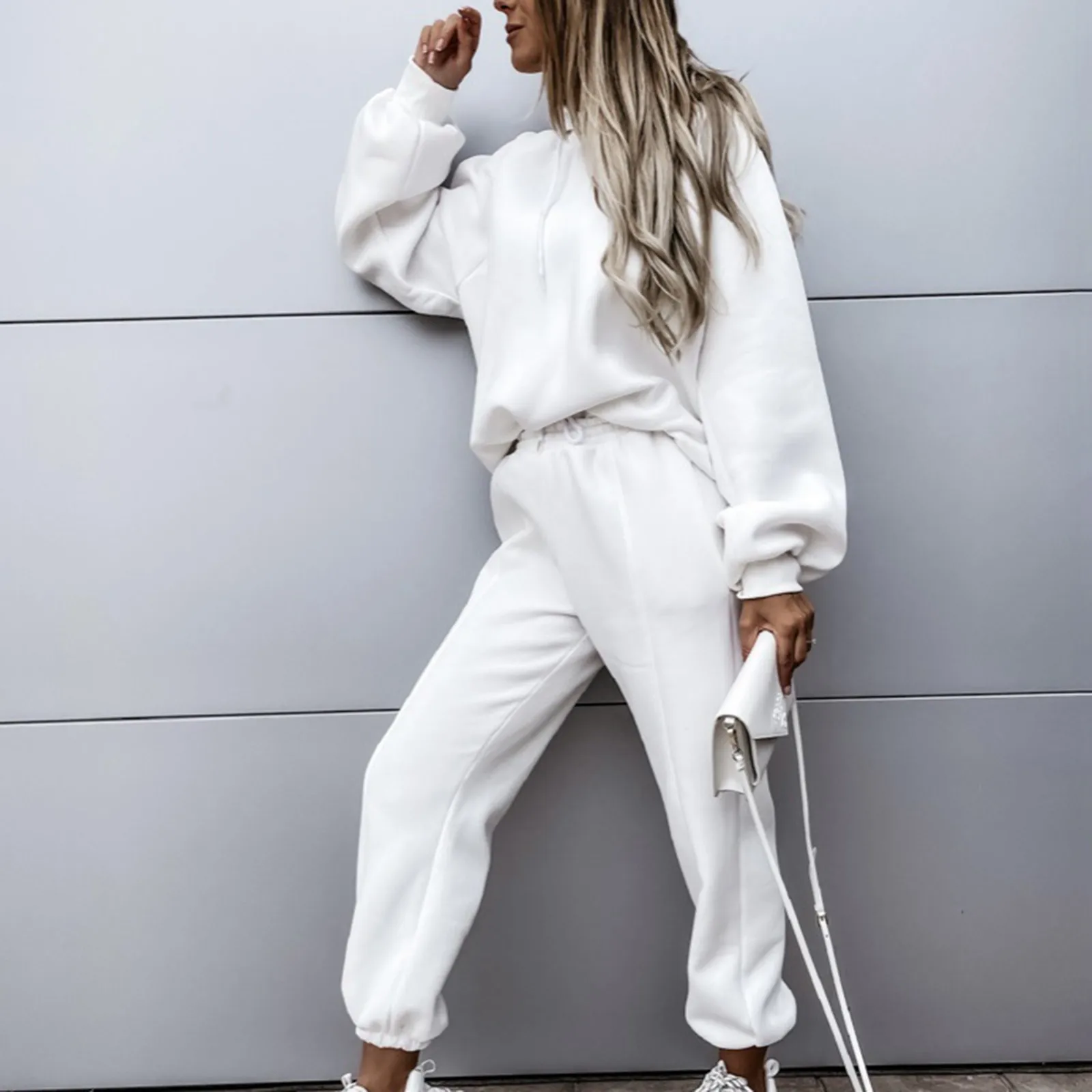 Зимний модный спортивный костюм, женский комплект из 2 предметов, однотонный пуловер с длинным рукавом, укороченный топ с капюшоном и штаны, повседневные спортивные костюмы для отдыха #40