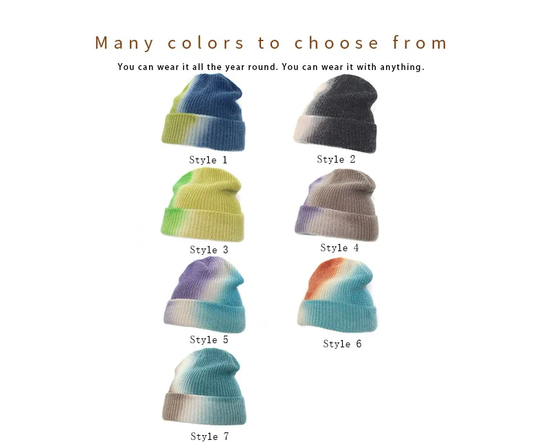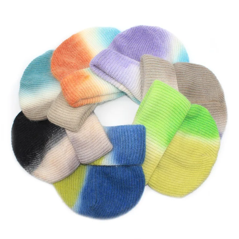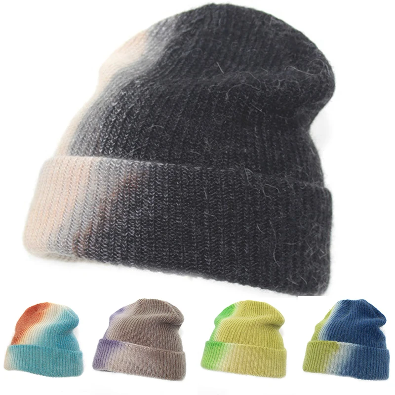Зимняя шапка с кроличьим мехом и принтом тай-дай, женская шапка с капюшоном, шерстяная шапка, шапка из кроличьего меха, кашемировая вязаная шапка для женщин