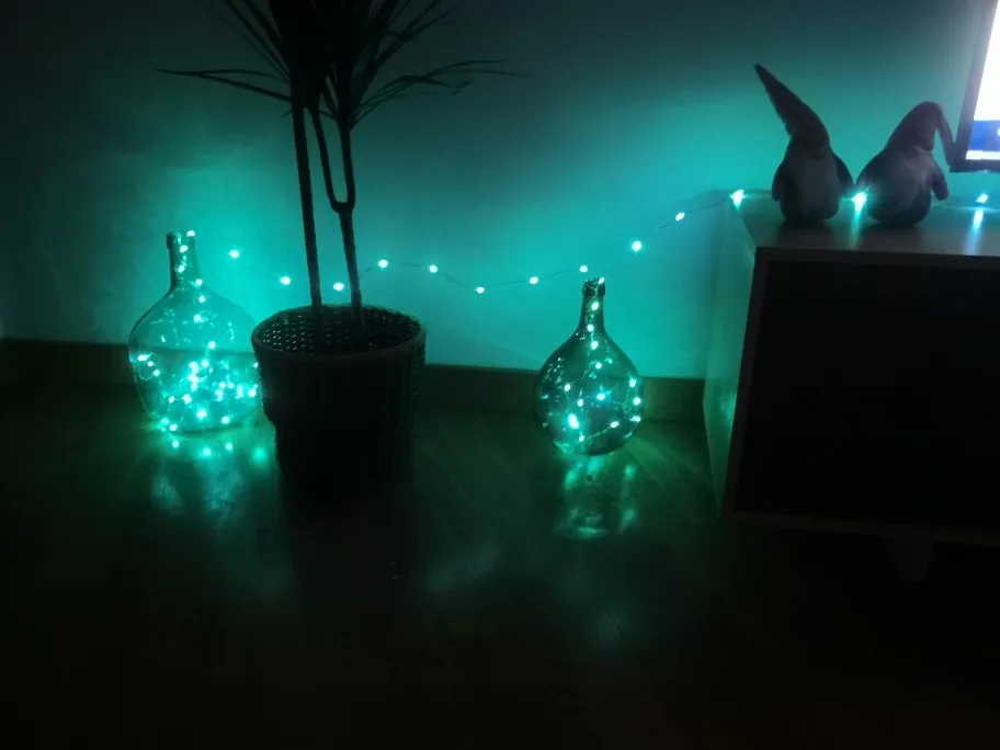 Гирлянда хорошая, можно регулировать оттенок и яркость, скорость смены цвета, встроены режимы градиента и резкой смены цветов. Приложение немного кривое, зачем то требует gps для поиска гирлянды, не весь интерфейс переведен. На звук реагирует либо когда ты запускаешь плейлист из приложения, либо с микрофона, но если приложение свернуть, то функция может перестать работать.