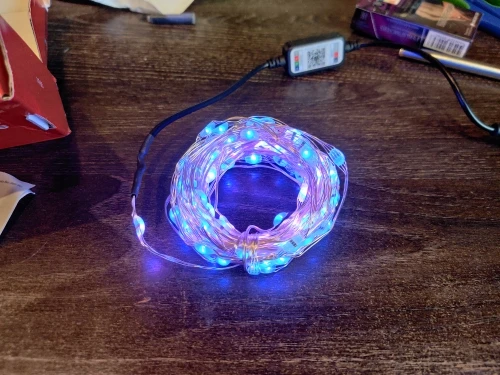 гирлянда работает от телефонной зарядки, цвет медленно меняется. код еще не скачал, поэтому про управление по изменению цвета не расскажу.