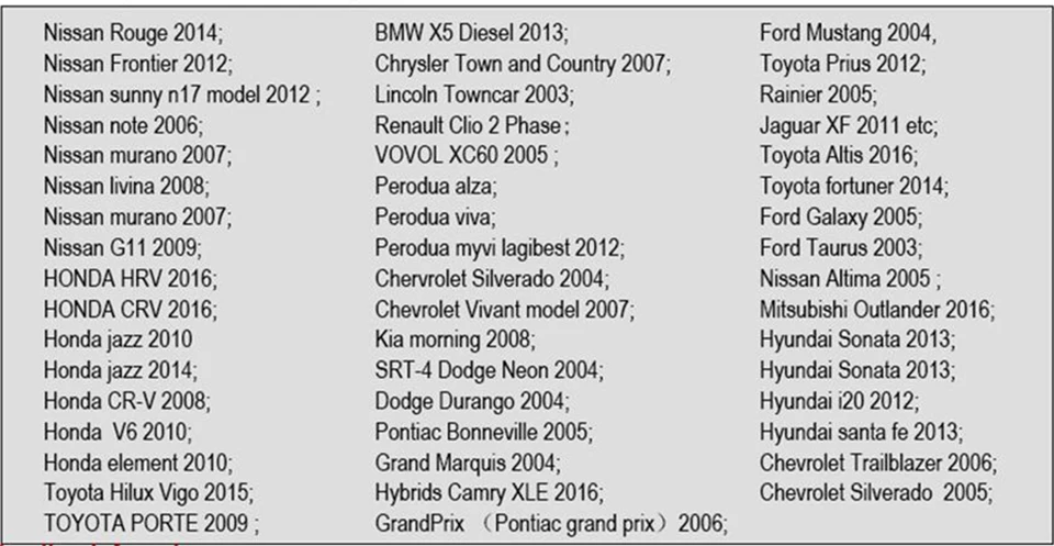 Несовместимость:НекоторыеЯпонские автомобили недоступны: Suzuki, Mazda 6, INFINITI (QX50 Q50Q501), Toyota AVANZA 2013, Lexus (is250, ex250, ES300H), Honda (Джаз,CRV) и автомобили, произведенные до 2008 года.