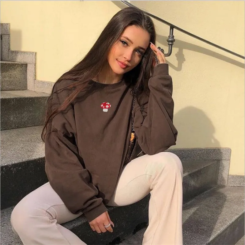 Свитшот в уличном стиле, новинка 2021, модная эстетичная Толстовка в стиле 90-х с длинным рукавом и вышивкой в виде грибов, зимняя одежда с круглым вырезом и графическим принтом