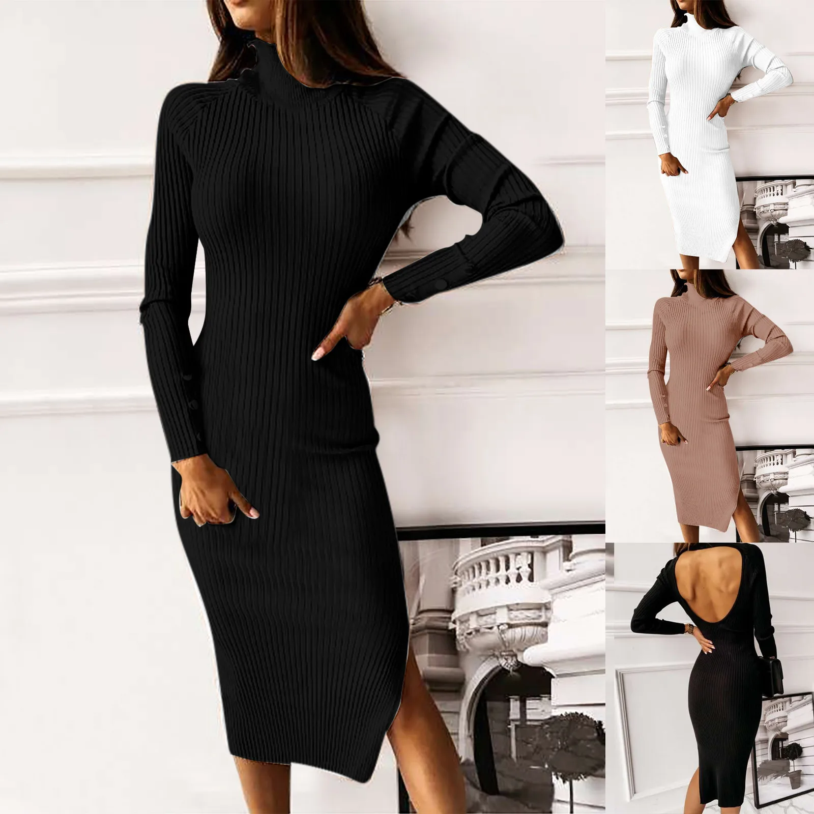Элегантное трикотажное платье-футляр средней длины, женские осенне-зимние платья, облегающее пикантное платье, минималистичное платье с длинным рукавом, женское платье